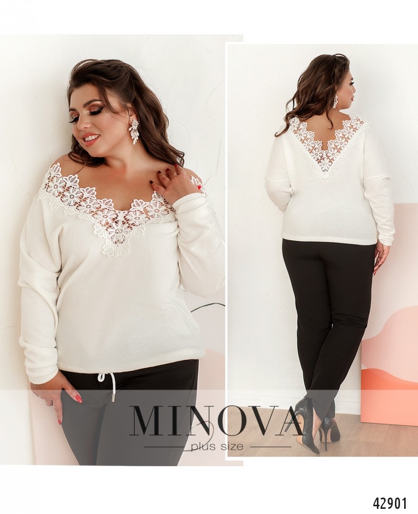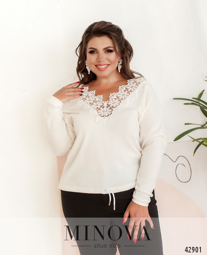 Элегантный пуловер батал с широким V-образным вырезом на груди и по спинке, украшенным цветочным кружевом. Через подол пропущен шнурок с наконечниками. Рукава без манжет. Застёжек и карманов нет.