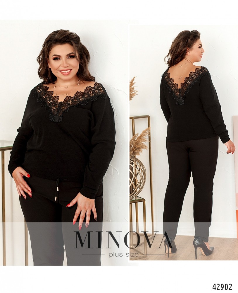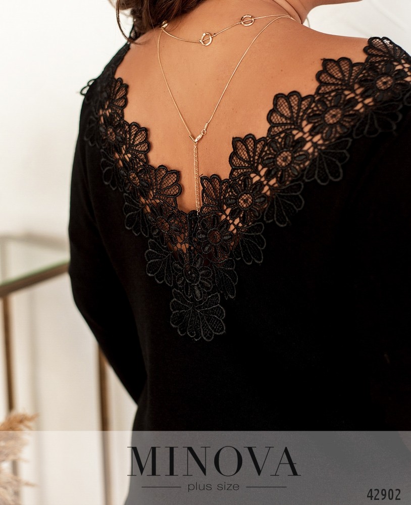 Элегантный пуловер батал с широким V-образным вырезом на груди и по спинке, украшенным цветочным кружевом. Через подол пропущен шнурок с наконечниками. Рукава без манжет. Застёжек и карманов нет.