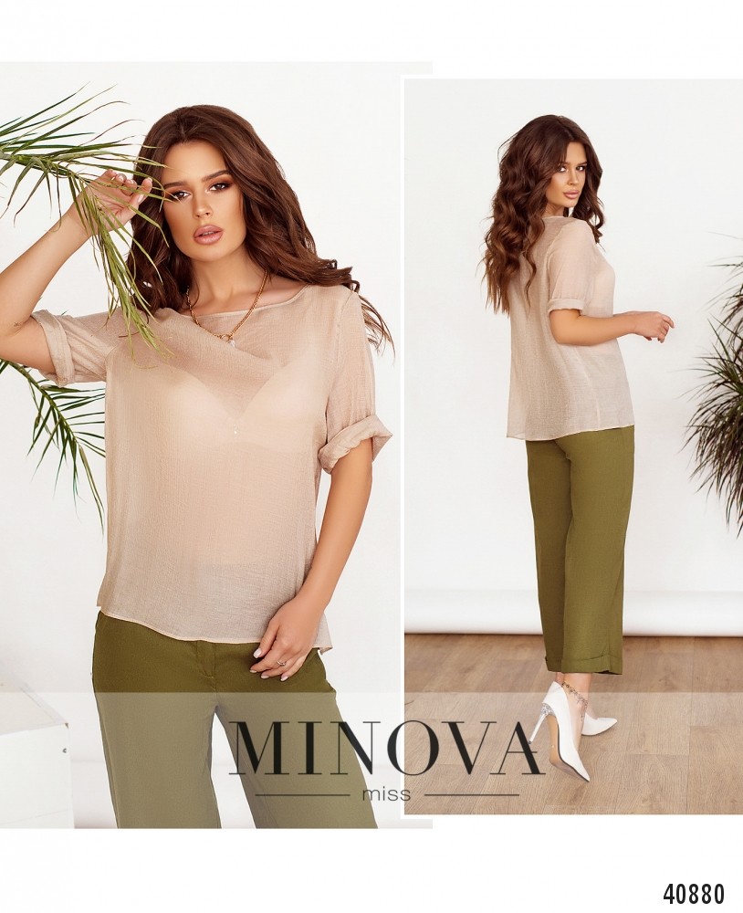 Лёгкая, воздушная, полупрозрачная блуза без застёжек и карманов, с небольшими отворотами на рукавах, вырез горловины "лодочка".
