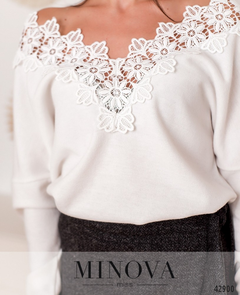 Стильный пуловер с кружевным широким V-образным вырезом на спинке и спереди. Рукава без манжет, застёжек и карманов нет. Через подол снизу пропущен шнурок с наконечниками.