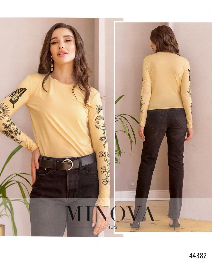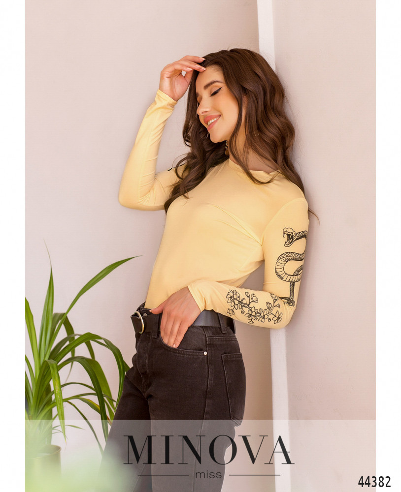 Лёгкий свитшот с ярким принтом на рукавах, вырез горловины полукруглый, карманов и застёжек нет. Рукава без манжет.