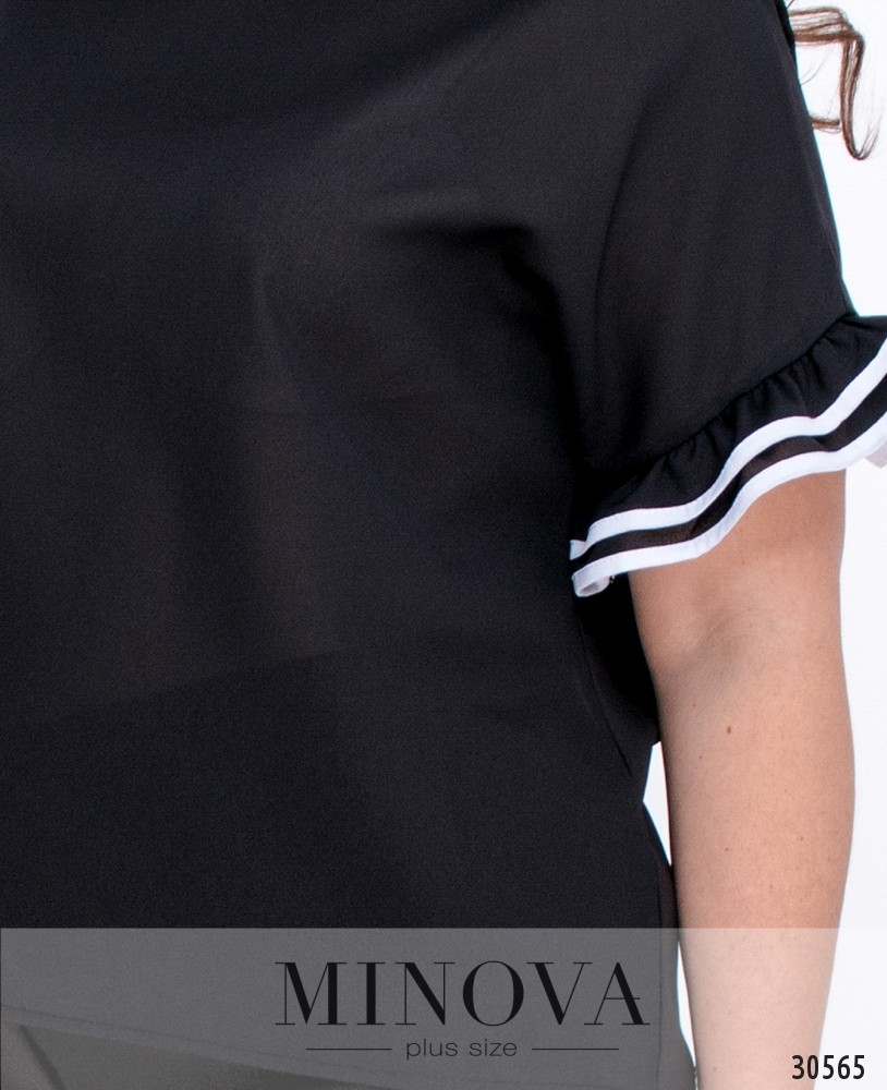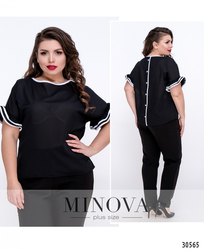 Свободная блуза прямого кроя с рукавами –воланами. Спинка украшена рядом декоративных пуговиц. Горловина, рукава и планка на спине выделены контрастным кантом.