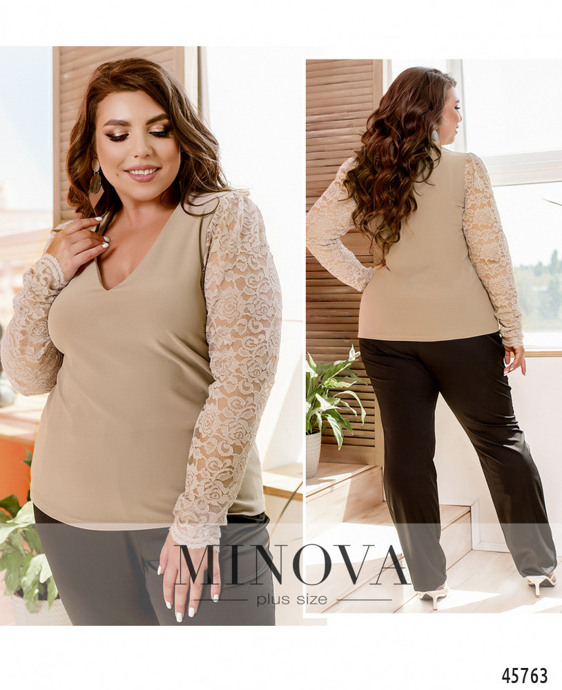 Нежная однотонная блуза добавит в ваш образ чуточку кокетства, романтизма и женственности. Изюминкой данной модели являются глубокий V-образный вырез и длинные кружевные рукава, подчеркивающие красоту ваших рук.