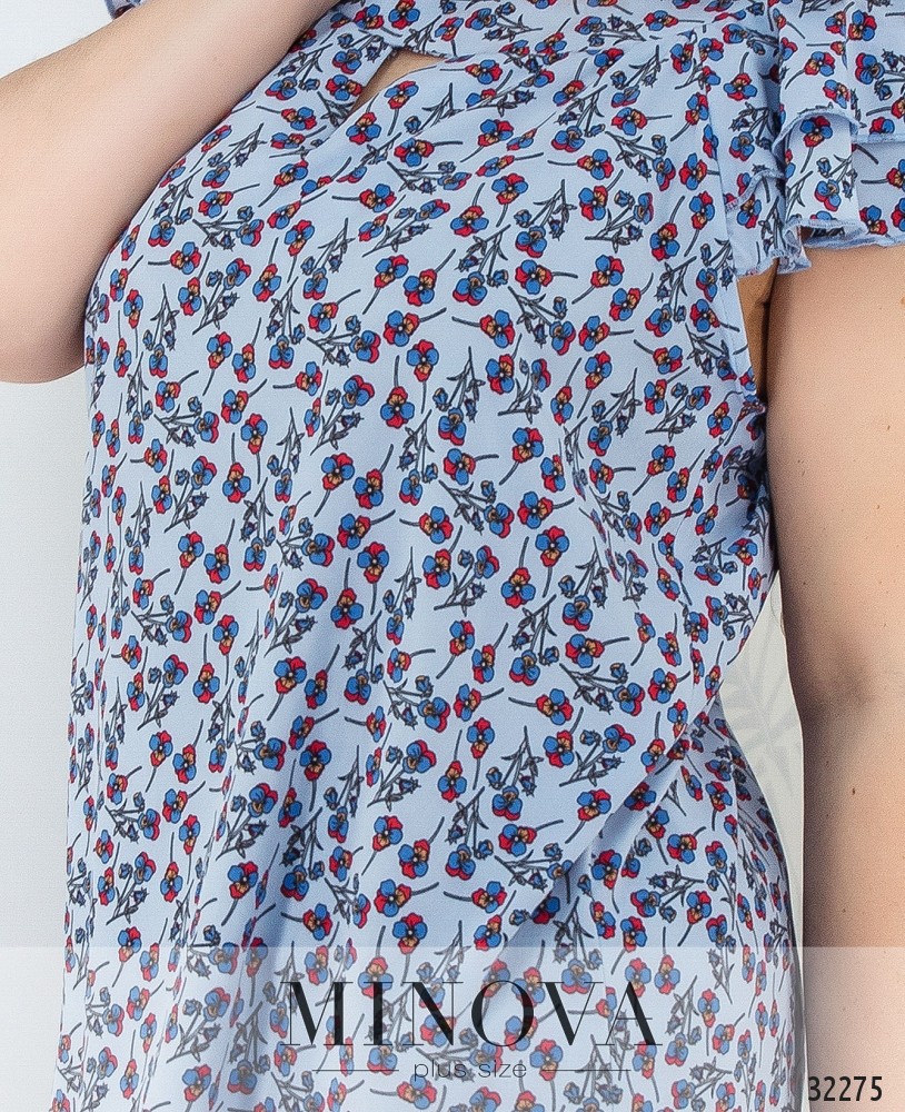Блуза прямого кроя с круглым вырезом. Короткие рукава блузы оформлены воланами. На груди рубашка украшена вырезом.