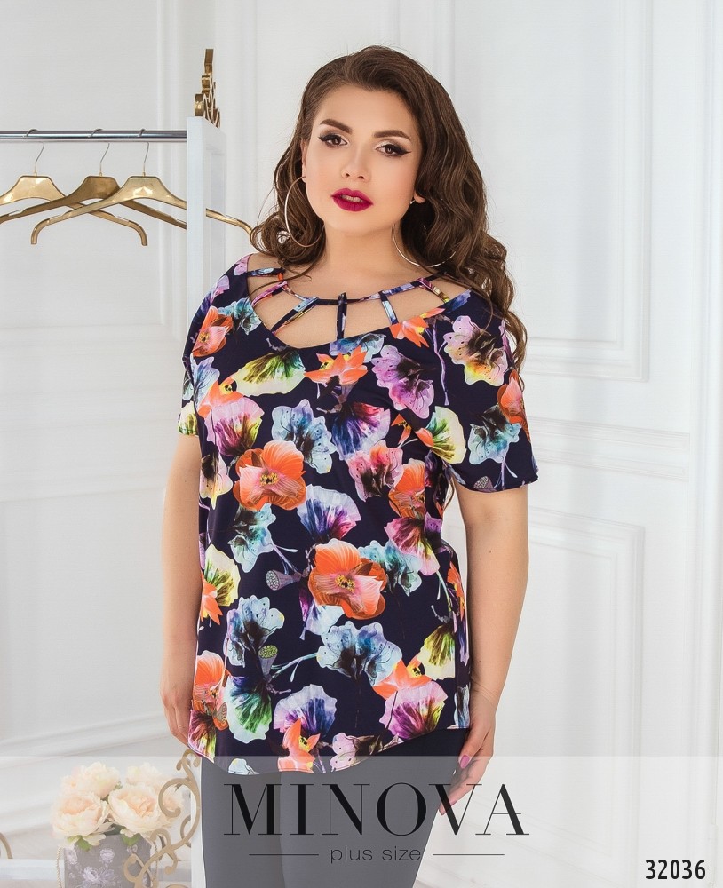 Яркий топ с оригинальной горловиной. Топ прямого кроя с короткими рукавами и закругленным подолом. V-образное декольте украшено декоративными петельками.