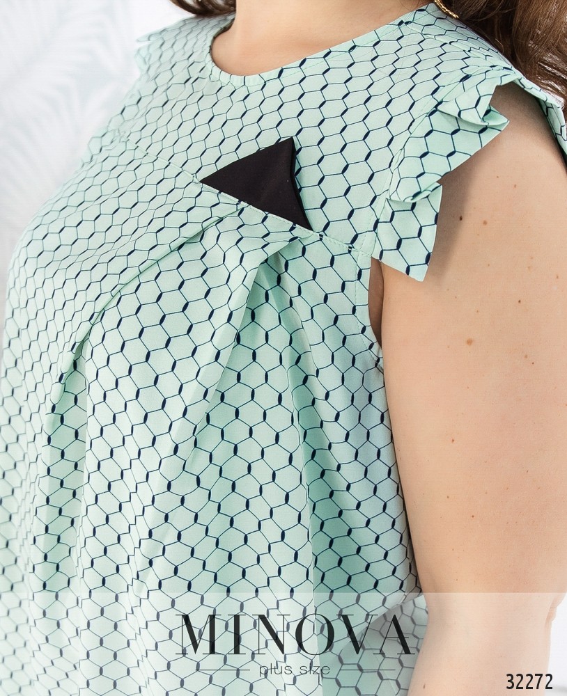 Свободная блуза без рукавов. Блуза, отрезная от кокетки, украшена декоративным кармашком. Рукава отделаны оборкой. Подол закруглен. Спинка отрезная кокетки. Горловина застегивается на пуговицу на спине.