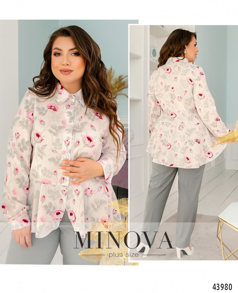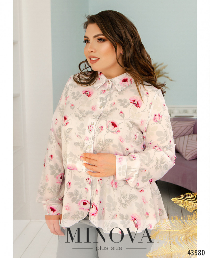 Элегантная блуза батал с нежным принтом, воротничок отложной, спереди - ряд пуговиц на планке. Рукава с манжетами, на манжетах по одной пуговке. Снизу к подолу подшиты мягкие оборки. На груди вытачки. Карманов нет.