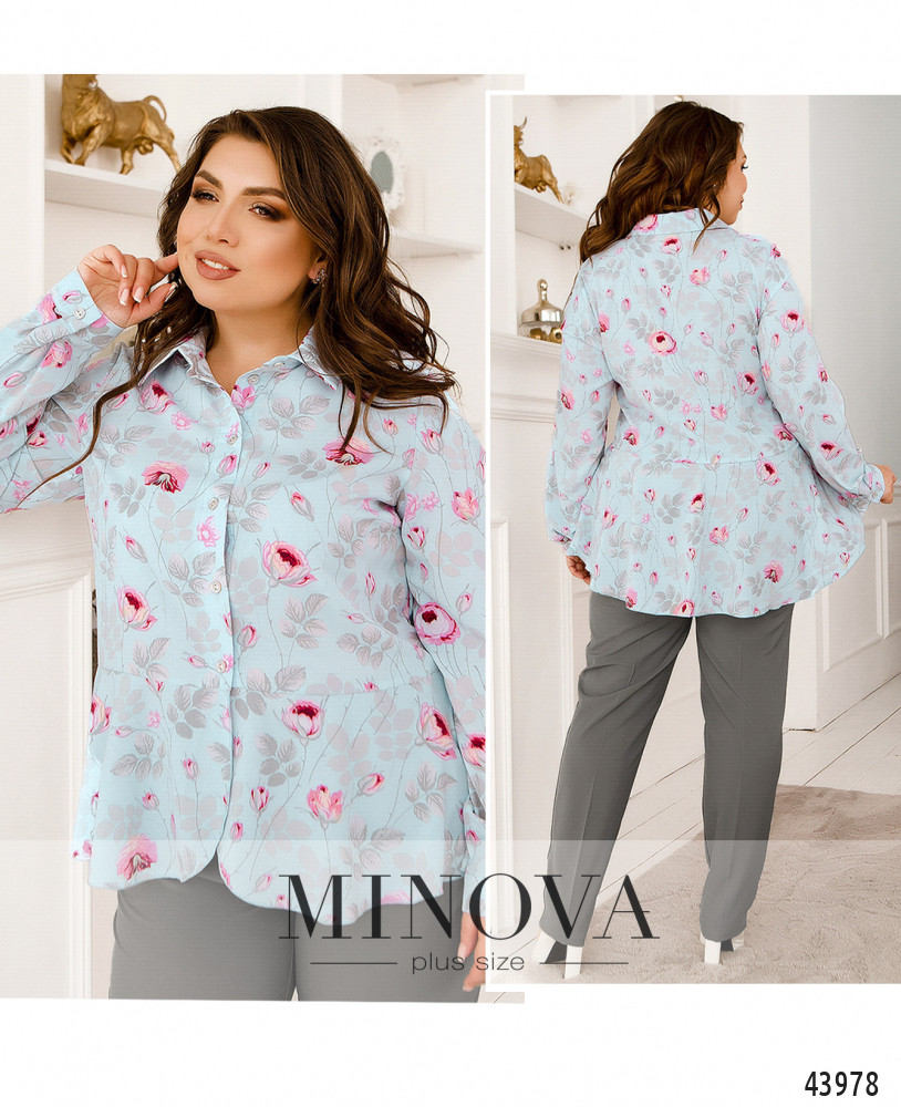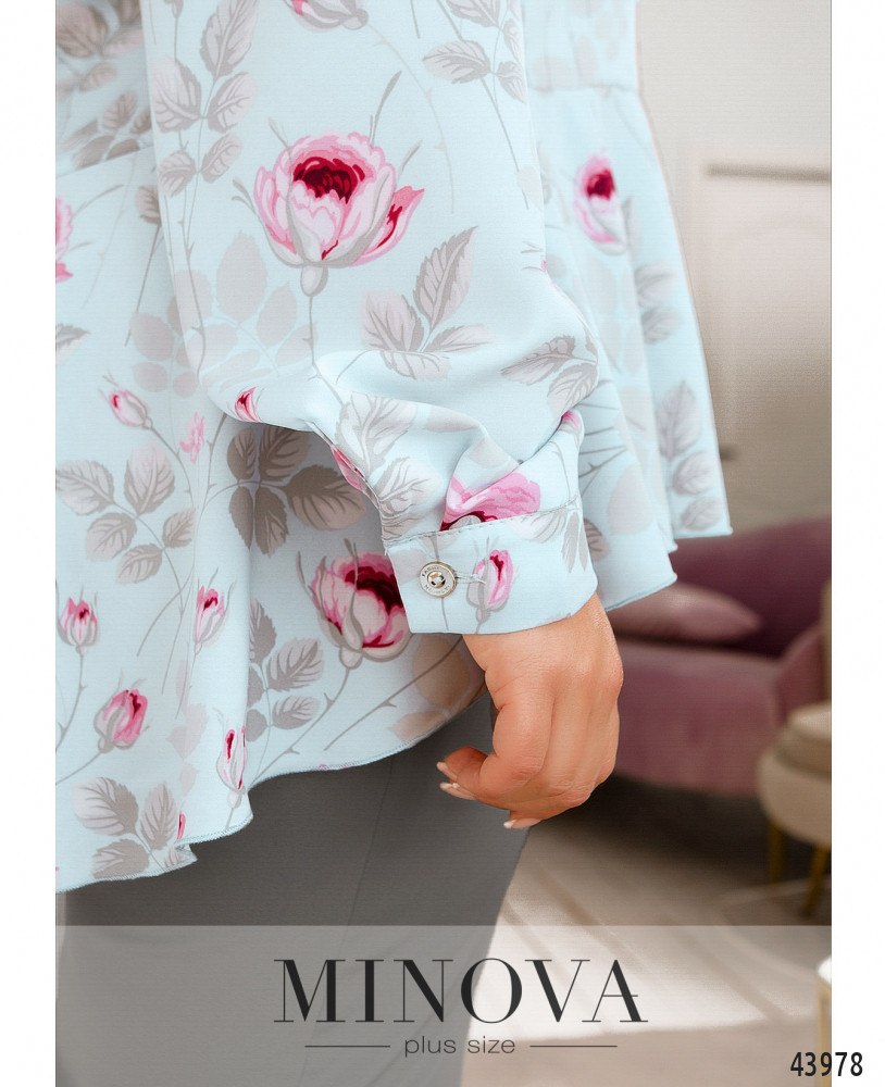 Элегантная блуза батал с нежным принтом, воротничок отложной, спереди - ряд пуговиц на планке. Рукава с манжетами, на манжетах по одной пуговке. Снизу к подолу подшиты мягкие оборки. На груди вытачки. Карманов нет.