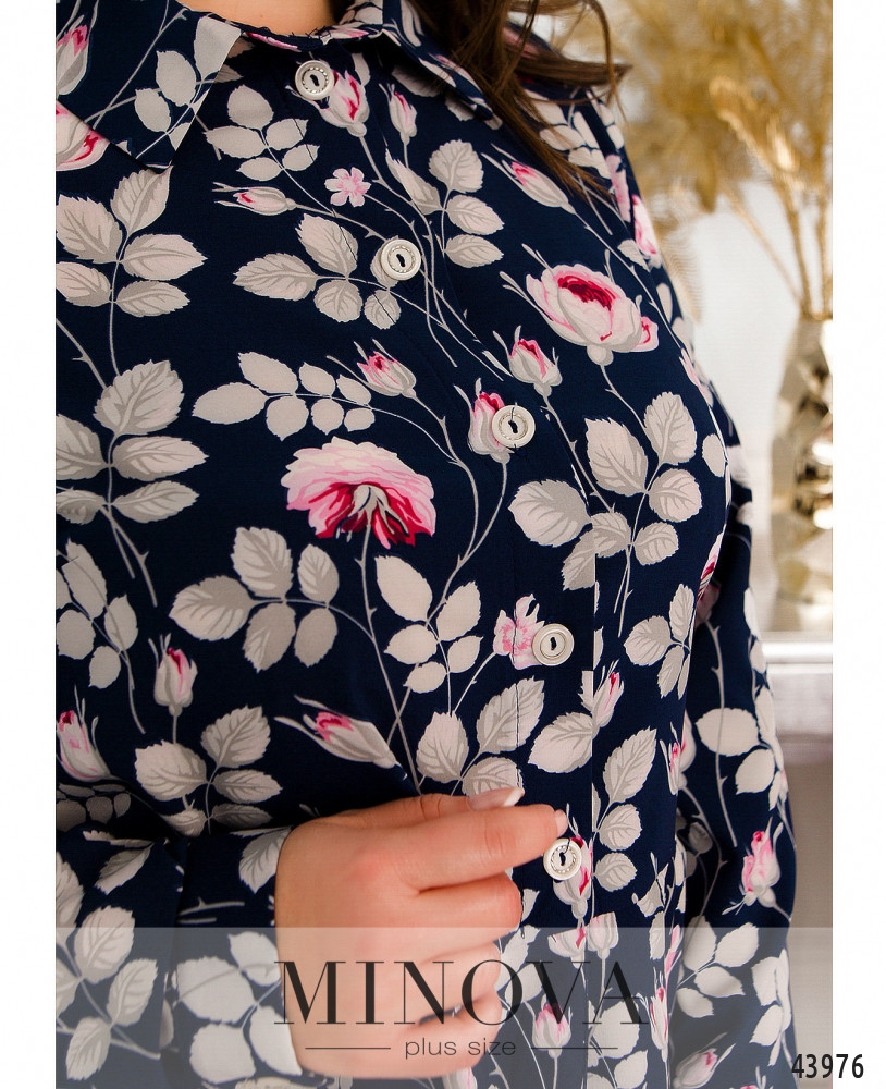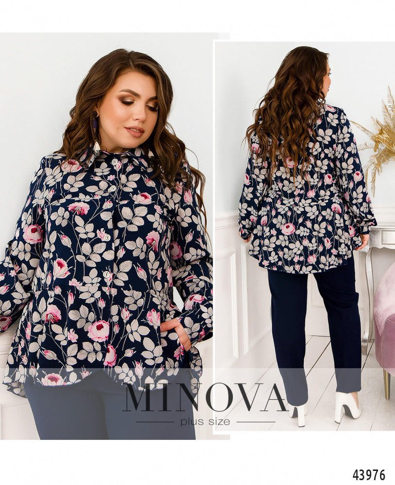 Элегантная блуза батал с нежным принтом, воротничок отложной, спереди - ряд пуговиц на планке. Рукава с манжетами, на манжетах по одной пуговке. Снизу к подолу подшиты мягкие оборки. На груди вытачки. Карманов нет.