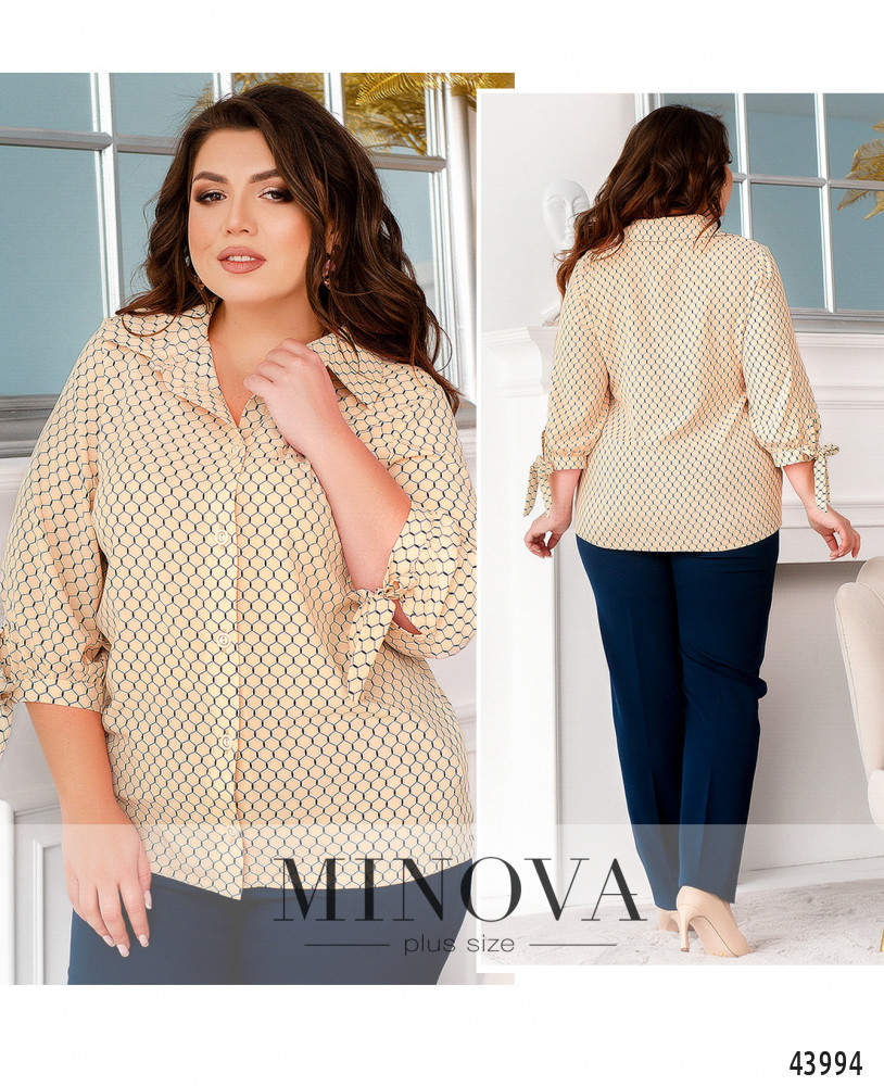 Нежная блуза батал с привлекательным принтом, на груди вытачки, рукава с мягкими манжетами, которые завязываются как ленты. Воротничок отложной, спереди - ряд пуговиц на планке. Карманов нет.