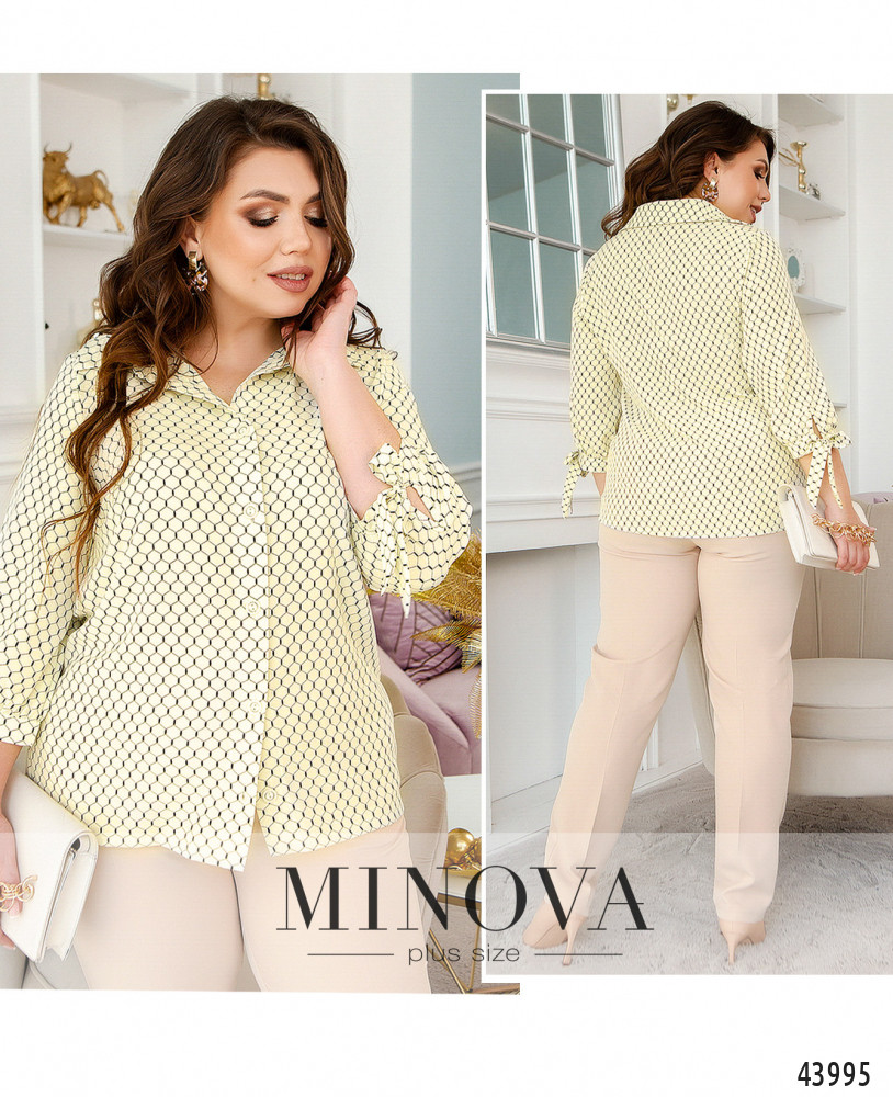 Нежная блуза батал с привлекательным принтом, на груди вытачки, рукава с мягкими манжетами, которые завязываются как ленты. Воротничок отложной, спереди - ряд пуговиц на планке. Карманов нет.