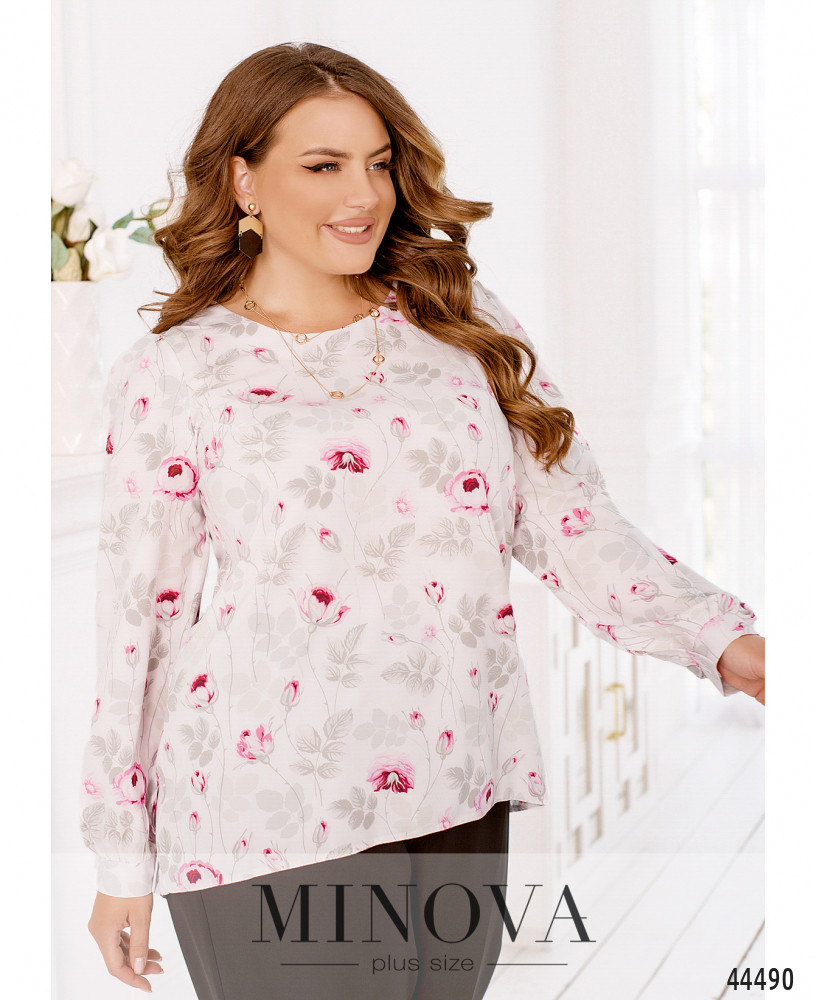 Элегантная и нежная блуза без застёжек и карманов, с полукруглым вырезом горловины. На груди диагональные вытачки. Рукав с узким манжетом, на манжетах по одной пуговке. Подол чуть длиннее по спинке.