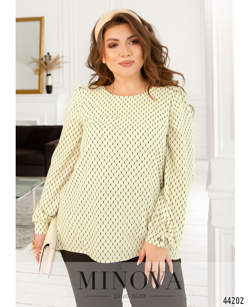 Элегантная и нежная блуза без застёжек и карманов, с полукруглым вырезом горловины. На груди диагональные вытачки. Рукав с узким манжетом, на манжетах по одной пуговке. Подол чуть длиннее по спинке.
