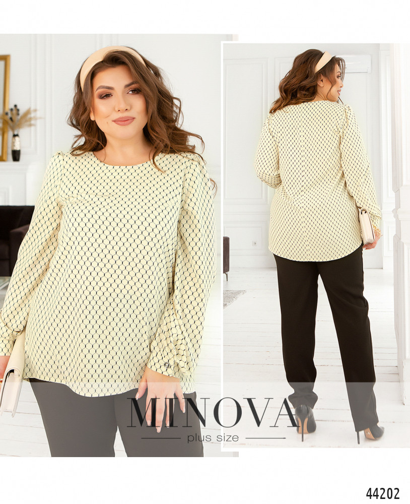 50-52 р-р: длина блузки 57-71см, длина рукава от плечевого шва 62см, обхват рукава 43см, ОГ - 106см, ОТ -113см, ОБ -118см.