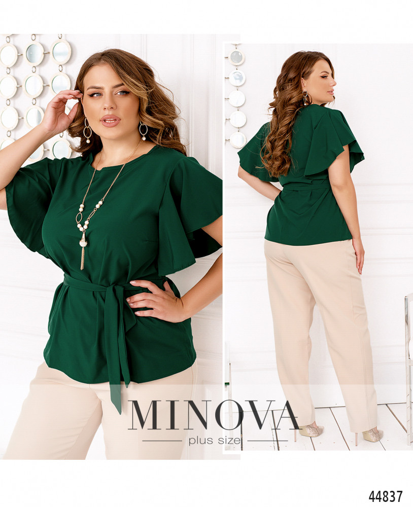 Элегантная и минималистичная блуза плюс сайз с рукавами-крылышками, ниспадающими мягкими оборками. На груди вытачки, застёжек и карманов нет, вырез горловины полукруглый. На талии по бокам подшиты шлейки для пояса.