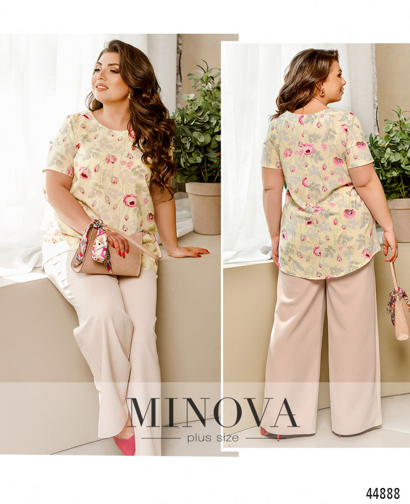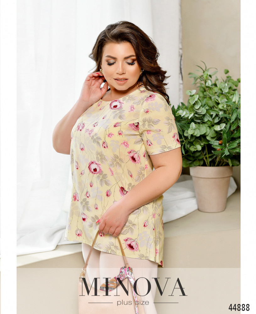 Яркая и женственная блузка батал с полукруглым вырезом горловины, на груди диагональные вытачки, рукава без манжет, застёжек нет. Подол по спинке чуть длиннее.