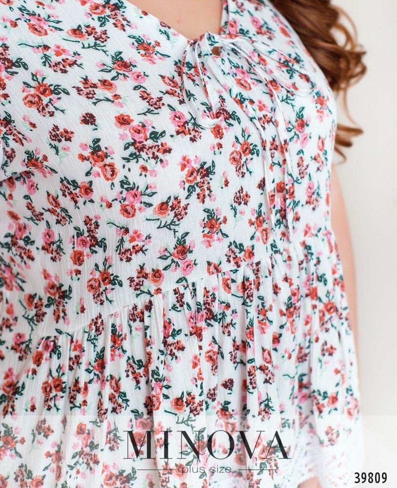 Женственная и романтичная блуза батал с оборками на талии, украшенными кружевом. Вырез горловины неглубокий, с завязками. Рукава-фонарики со вшитыми резинками. Без застёжек и карманов.
