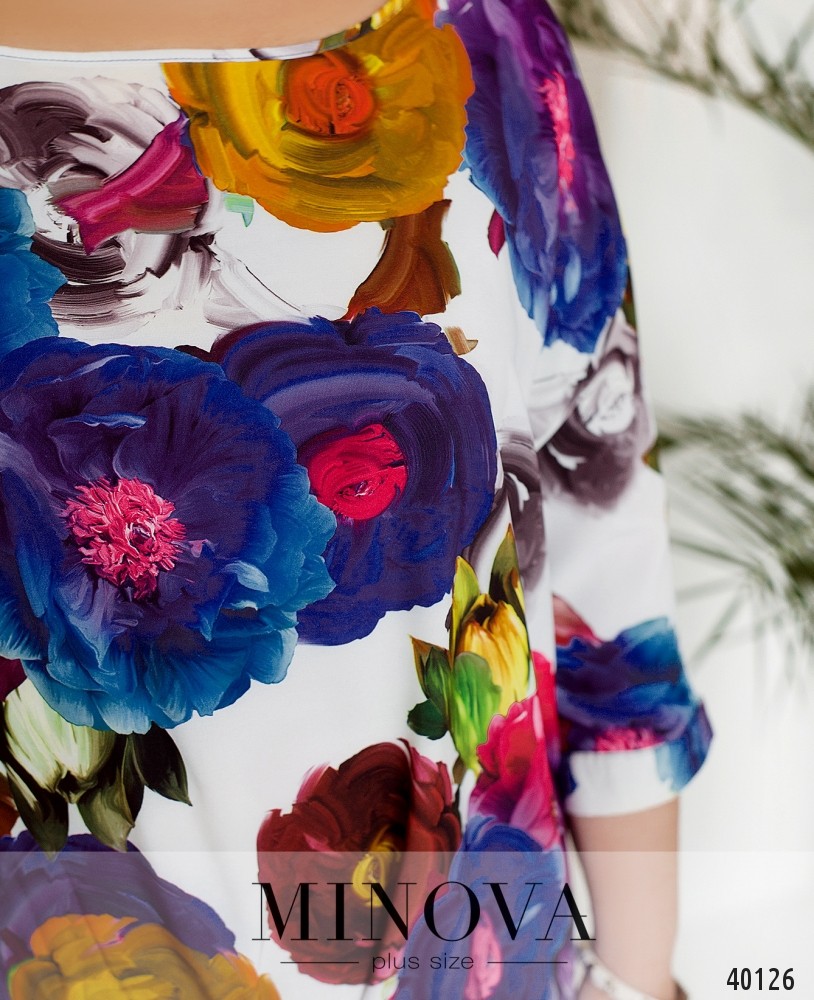 Яркая блуза с цветочным пастельным принтом, без застёжек и карманов, вырез горловины "лодочка", рукава с манжетами, на манжетах по одной пуговице. Подол присобран спереди, асимметричный.