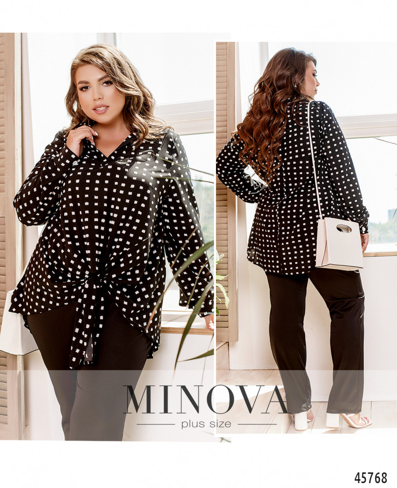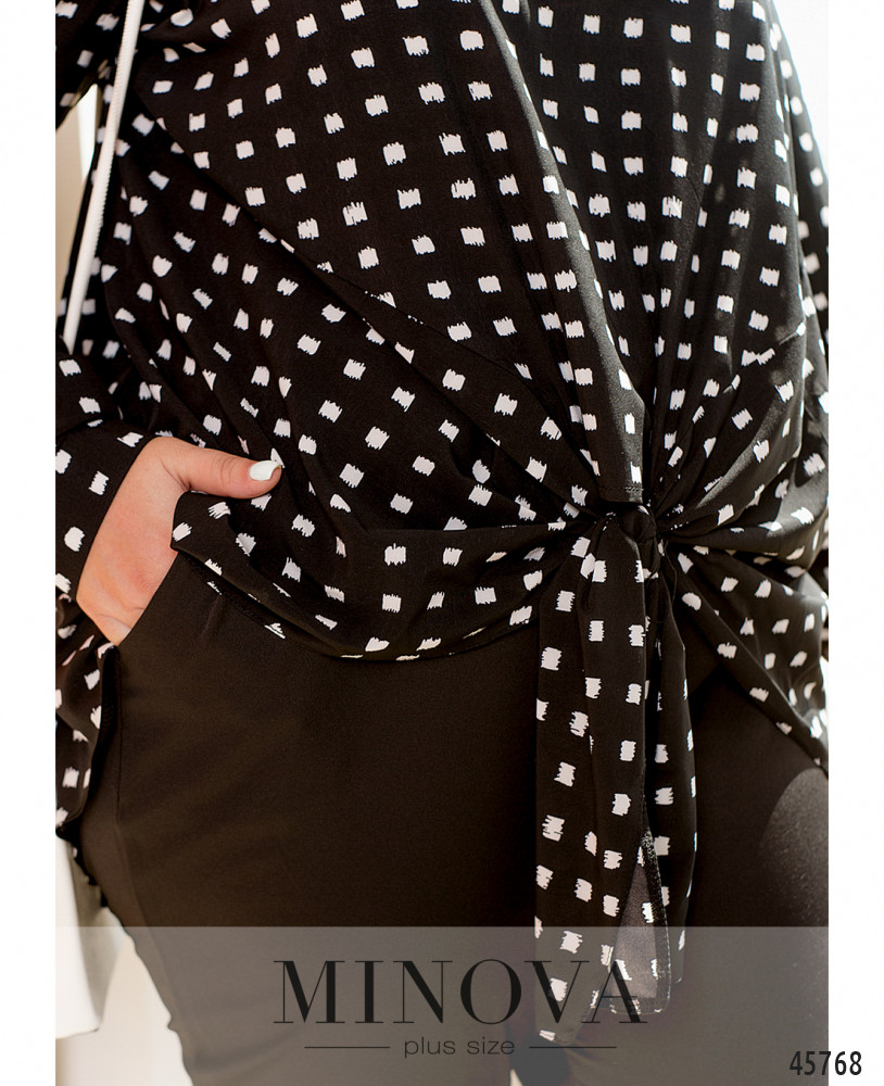 Яркая стильная рубашка с воротником и длинными рукавами с манжетами создает не только красоту, уверенность и комфорт, но и подчеркивает индивидуальный стиль. Изюминкой данной модели является ассиметричный подол, удлиненный по спинке, и завязки спереди.