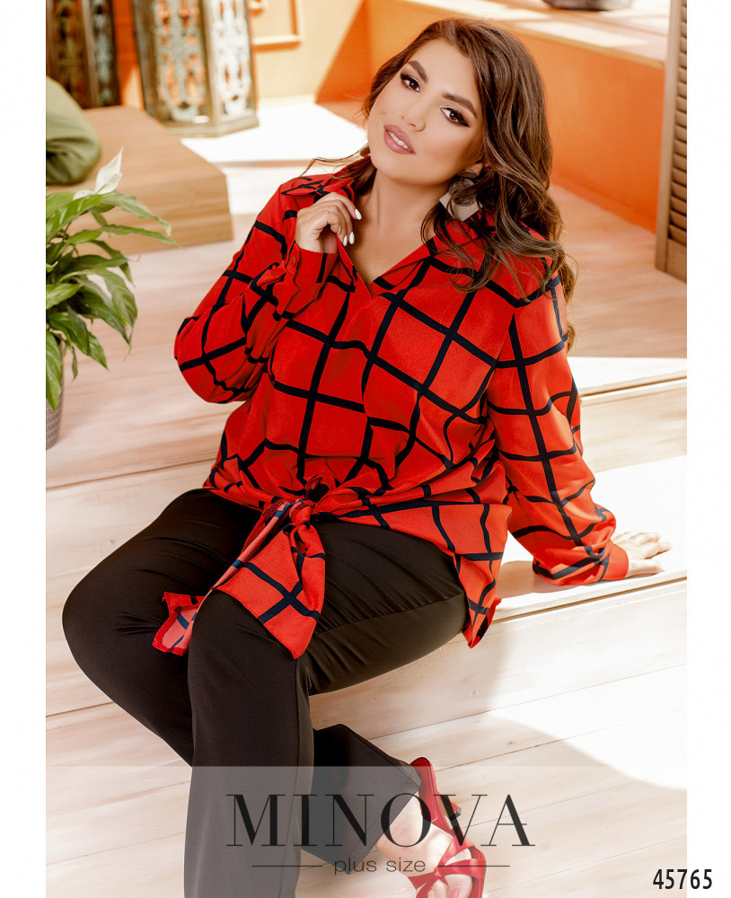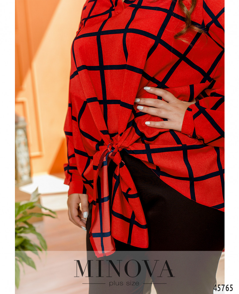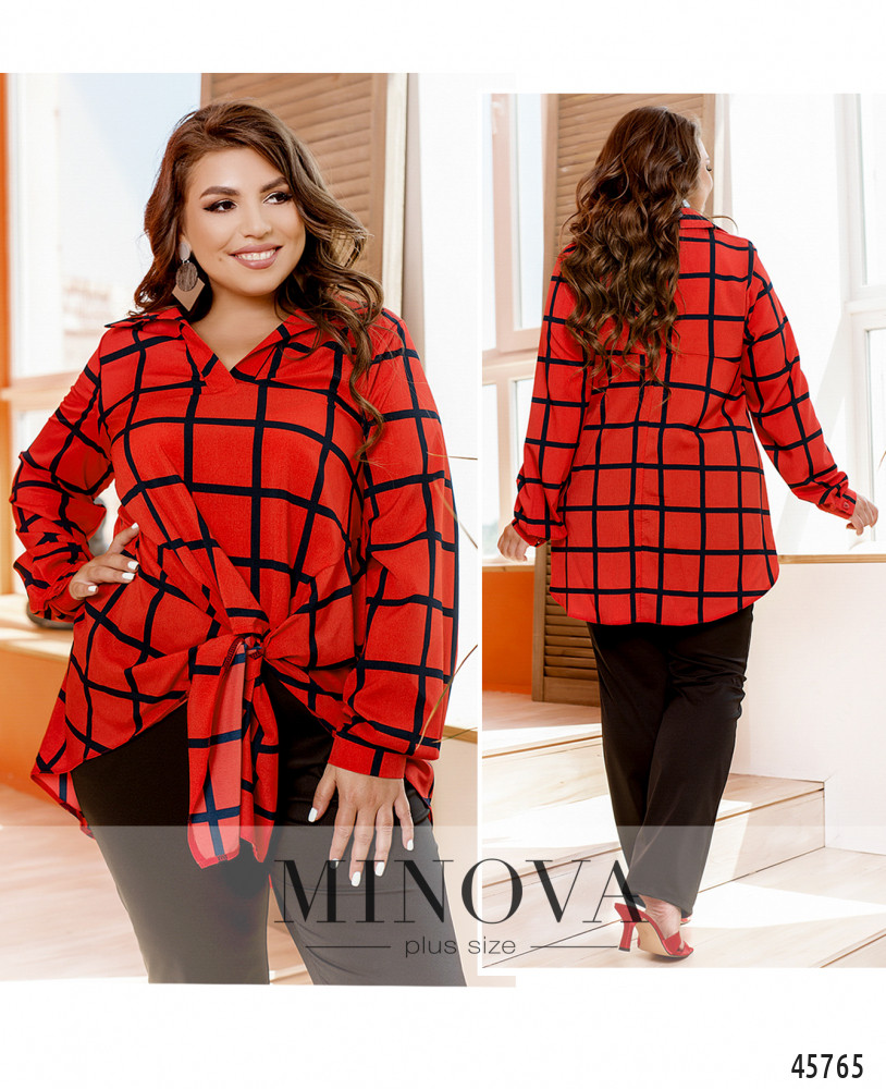 Яркая стильная рубашка с воротником и длинными рукавами с манжетами создает не только красоту, уверенность и комфорт, но и подчеркивает индивидуальный стиль. Изюминкой данной модели является ассиметричный подол, удлиненный по спинке, и завязки спереди.