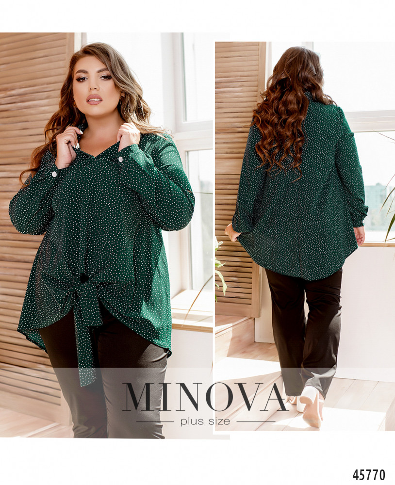 Яркая стильная рубашка с воротником и длинными рукавами с манжетами создает не только красоту, уверенность и комфорт, но и подчеркивает индивидуальный стиль. Изюминкой данной модели является ассиметричный подол, удлиненный по спинке, и завязки спереди.