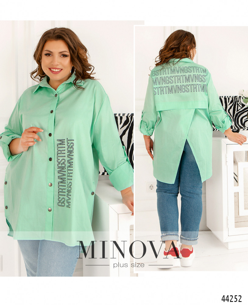 Длинная яркая рубашка батал с отложным воротничком и рядом кнопок спереди на планке, от воротничка до низу. Рукава с манжетами, на манжетах по одной кнопке, регулируются также на ленту и кнопку. Полочка и спинка декорированы принтом. Подол по спинке отрезной, запахнутый. По бокам подола - разрезы, застёгиваются на кнопки. Карманов нет. Накатка и фурнитура хорошего качества.