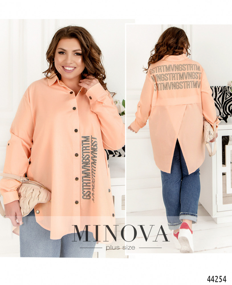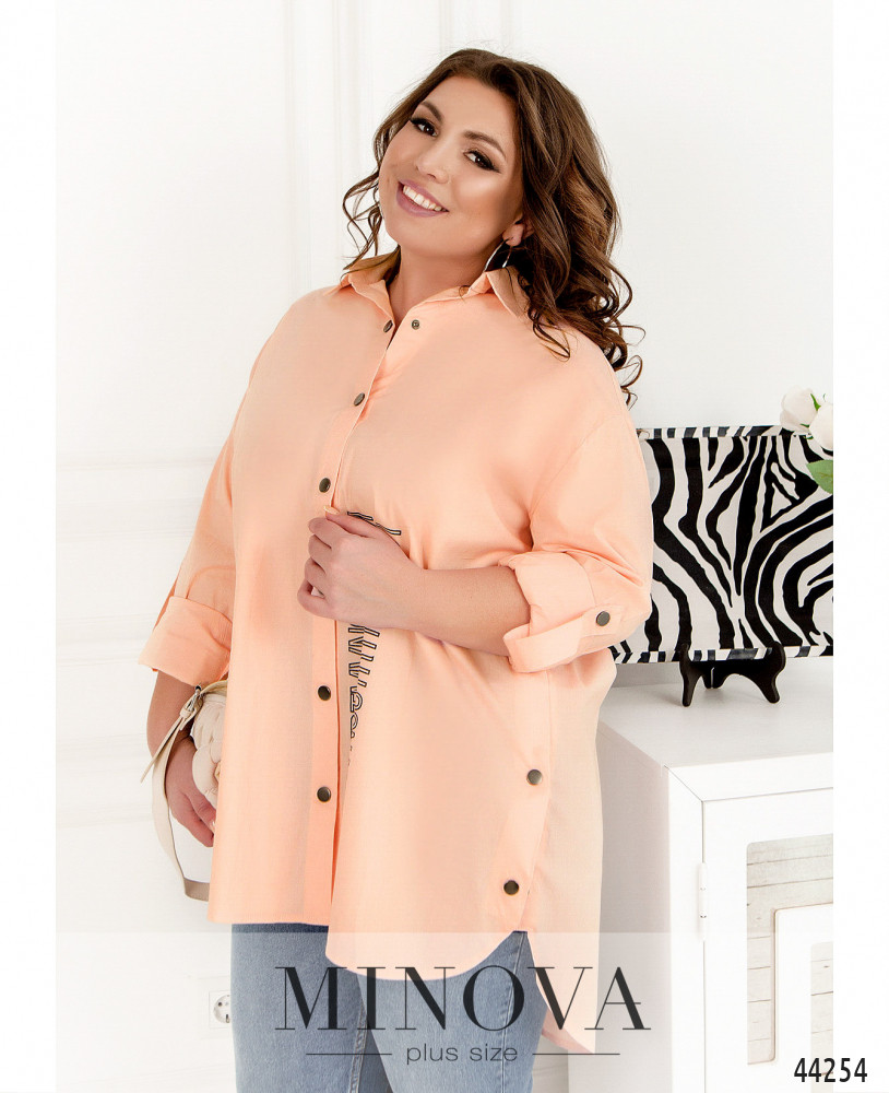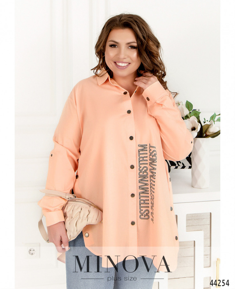 Длинная яркая рубашка батал с отложным воротничком и рядом кнопок спереди на планке, от воротничка до низу. Рукава с манжетами, на манжетах по одной кнопке, регулируются также на ленту и кнопку. Полочка и спинка декорированы принтом. Подол по спинке отрезной, запахнутый. По бокам подола - разрезы, застёгиваются на кнопки. Карманов нет. Накатка и фурнитура хорошего качества.