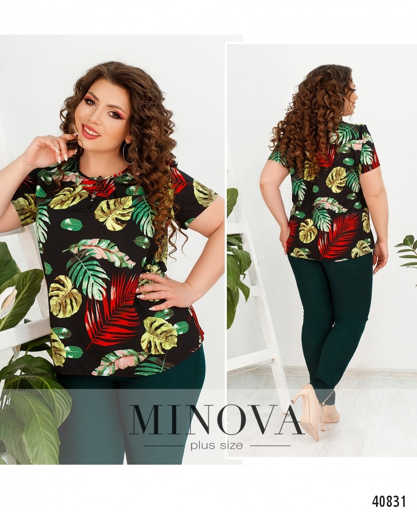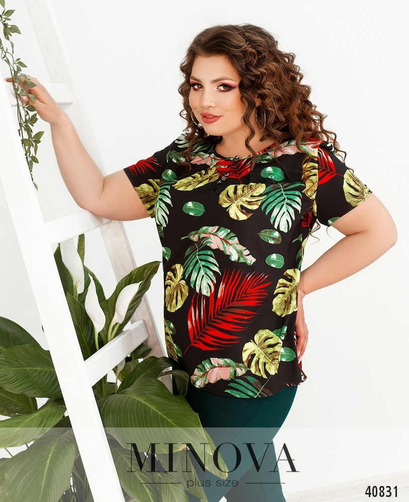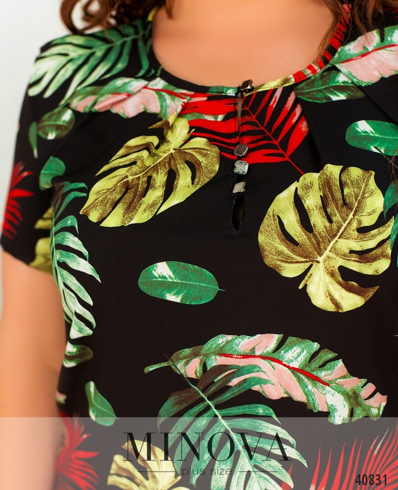 Нарядная и оригинальная блуза большого размера с полукруглым вырезом горловины, под ним - пуговицы с петельками и декоративные оборки. Рукава без манжет, карманов нет.