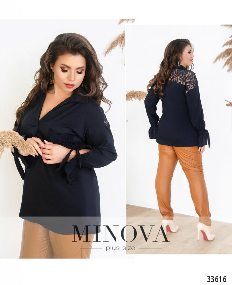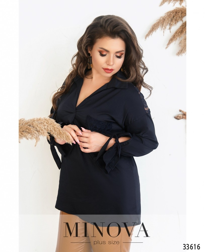 Лёгкая и очень женственная рубашка из свежей коллекции женской одежды от Minova пригодится при создании нарядного офисного дресс-кода, а если выбрать не белый, а тёмный вариант, то и самый строгий начальник не придерётся. Рубашка с отложным воротничком, без пуговиц, вырез горловины V-образный, подол ровный. Рукава полной длины, манжеты слегка асимметричные, с оборками, и на манжетах ленты, которые можно завязать на бант. На левой полочке – накладной карман, украшенный нежным цветочным принтом. Такой же принт декорирует плечи и кокетку (верхнюю часть спинки). Прекрасно будет сочетаться как с юбкой, так и с джинсами или брюками.