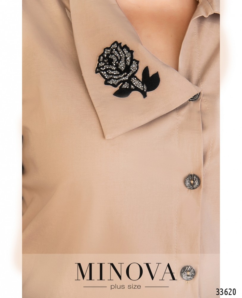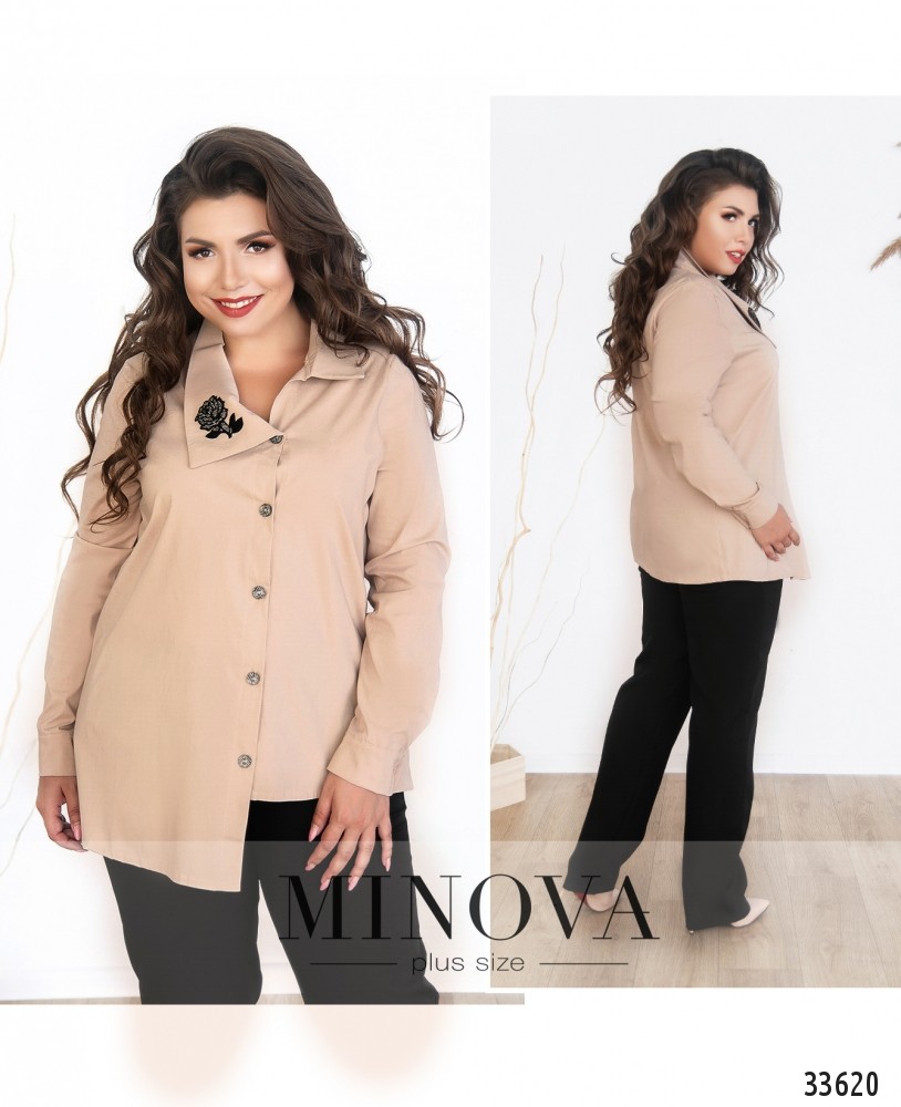 Если вам хочется внести нотку легкомыслия и бесшабашности в свой повседневный гардероб, стоит обратить внимание на новую модель рубашки из каталога женской одежды от Minova. Фасон создан так, чтобы создавалось впечатление, будто вы случайно застегнули её на пуговку ниже: асимметричное расположение воротника и подола, а также непрямое расположение пуговиц отлично создают такой эффект. Правая сторона отложного воротничка чуть шире и украшена декоративной нашивкой в виде цветка. Рукава полной длины, с пуговкой на манжете. Ткань лёгкая, приятная к телу. Рекомендуется для неформальной обстановки в сочетании с юбкой, джинсами или брюками.