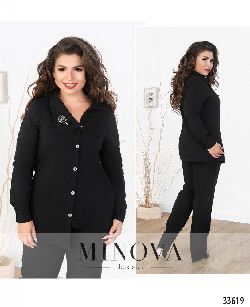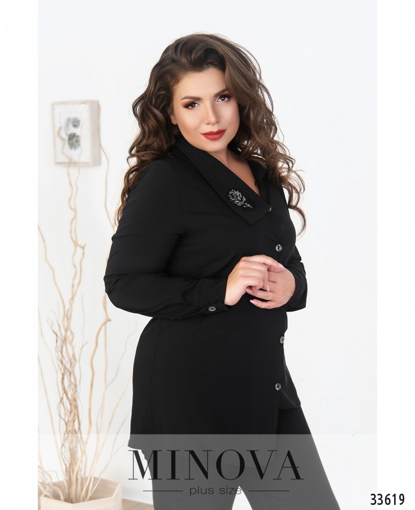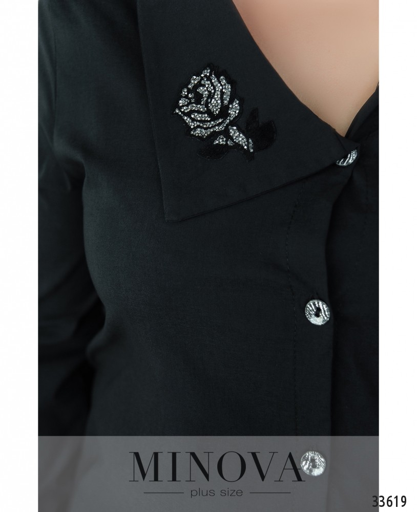 Если вам хочется внести нотку легкомыслия и бесшабашности в свой повседневный гардероб, стоит обратить внимание на новую модель рубашки из каталога женской одежды от Minova. Фасон создан так, чтобы создавалось впечатление, будто вы случайно застегнули её на пуговку ниже: асимметричное расположение воротника и подола, а также непрямое расположение пуговиц отлично создают такой эффект. Правая сторона отложного воротничка чуть шире и украшена декоративной нашивкой в виде цветка. Рукава полной длины, с пуговкой на манжете. Ткань лёгкая, приятная к телу. Рекомендуется для неформальной обстановки в сочетании с юбкой, джинсами или брюками.
