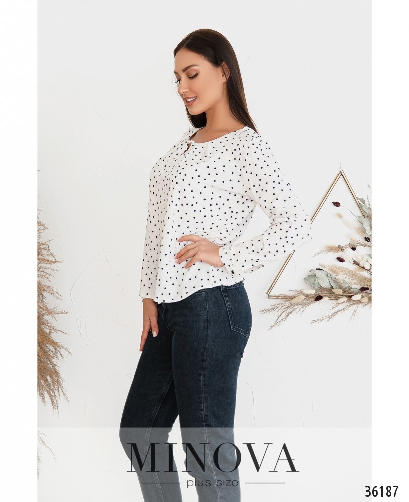 Приятная нарядная блуза батал из новой коллекции Minova представлена в нескольких оттенках и принтах – в «соты», в горошек или без принта. Цвета – яркие и пастельные. Блуза из лёгкой ткани, с рукавами полной длины, которые могут регулироваться с помощью пуговки и ленты. На рукавах – небольшие манжеты с одной пуговицей. Вырез горловины полукруглый, неглубокий, по центру вставлено металлическое украшение с «жемчужными» наконечниками. Ткань от горловины присобрана по диагонали, так что будет хорошо сидеть даже на объёмном бюсте. Застёжек и карманов нет. Можешь сочетать блузу со строгими брюками или любимыми удобными джинсами.