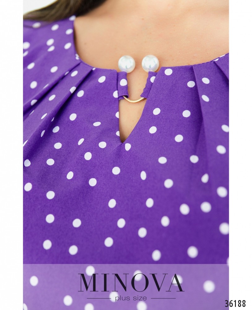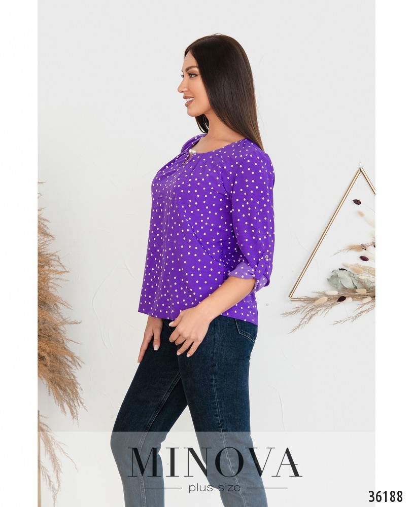Приятная нарядная блуза батал из новой коллекции Minova представлена в нескольких оттенках и принтах – в «соты», в горошек или без принта. Цвета – яркие и пастельные. Блуза из лёгкой ткани, с рукавами полной длины, которые могут регулироваться с помощью пуговки и ленты. На рукавах – небольшие манжеты с одной пуговицей. Вырез горловины полукруглый, неглубокий, по центру вставлено металлическое украшение с «жемчужными» наконечниками. Ткань от горловины присобрана по диагонали, так что будет хорошо сидеть даже на объёмном бюсте. Застёжек и карманов нет. Можешь сочетать блузу со строгими брюками или любимыми удобными джинсами.