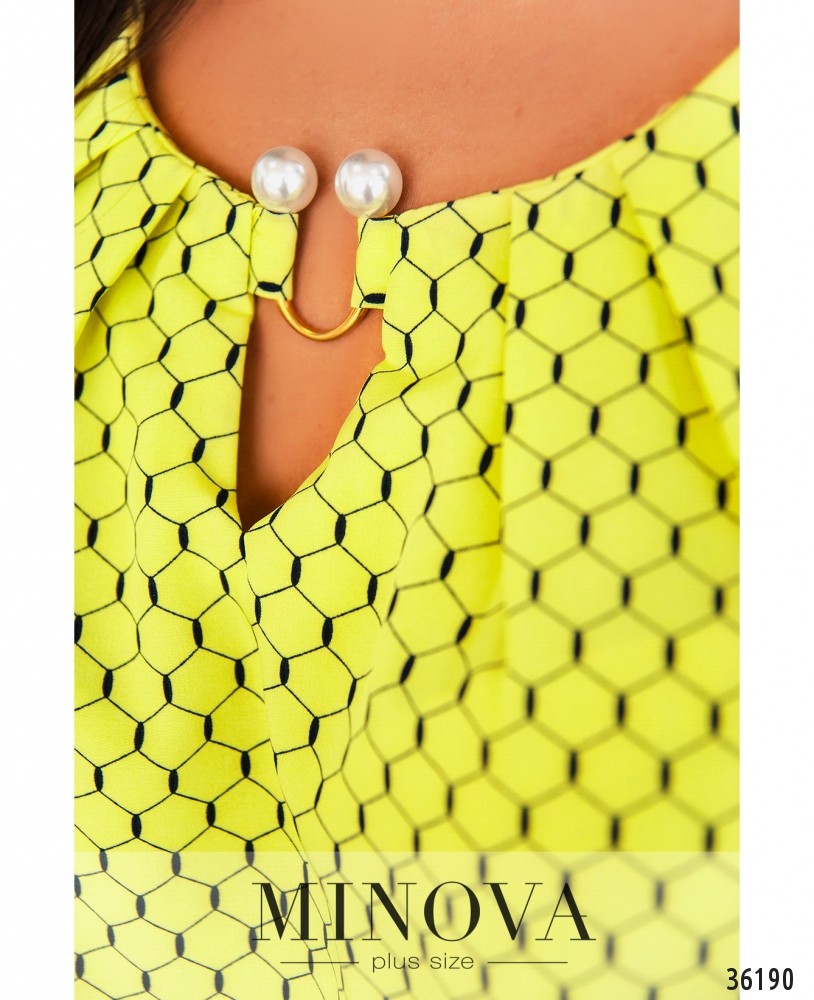 Приятная нарядная блуза батал из новой коллекции Minova представлена в нескольких оттенках и принтах – в «соты», в горошек или без принта. Цвета – яркие и пастельные. Блуза из лёгкой ткани, с рукавами полной длины, которые могут регулироваться с помощью пуговки и ленты. На рукавах – небольшие манжеты с одной пуговицей. Вырез горловины полукруглый, неглубокий, по центру вставлено металлическое украшение с «жемчужными» наконечниками. Ткань от горловины присобрана по диагонали, так что будет хорошо сидеть даже на объёмном бюсте. Застёжек и карманов нет. Можешь сочетать блузу со строгими брюками или любимыми удобными джинсами.