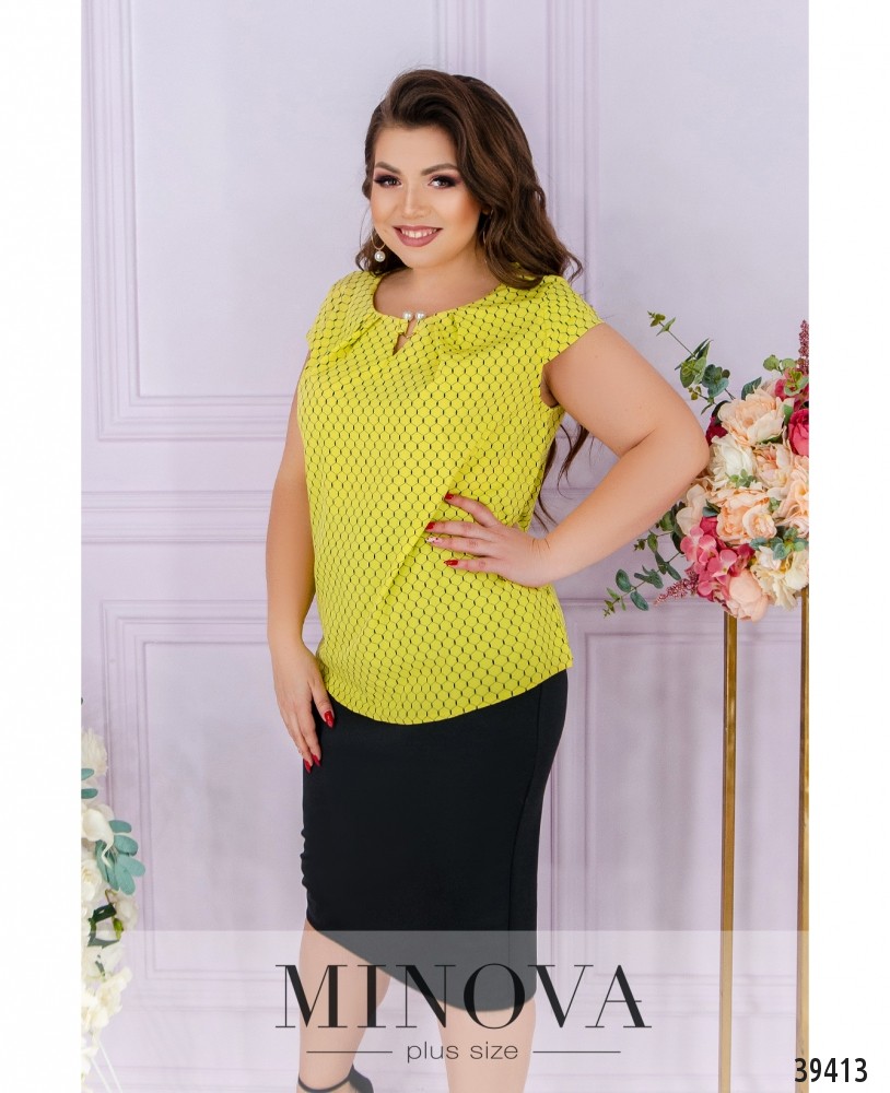 Аккуратная лёгкая блуза с рукавом-лепестком, вырез горловины полукруглый с небольшим вырезом, декорирован золотистым декором с бусинами. Карманов и застёжек нет. Ткань сверху присобрана, крой свободный.