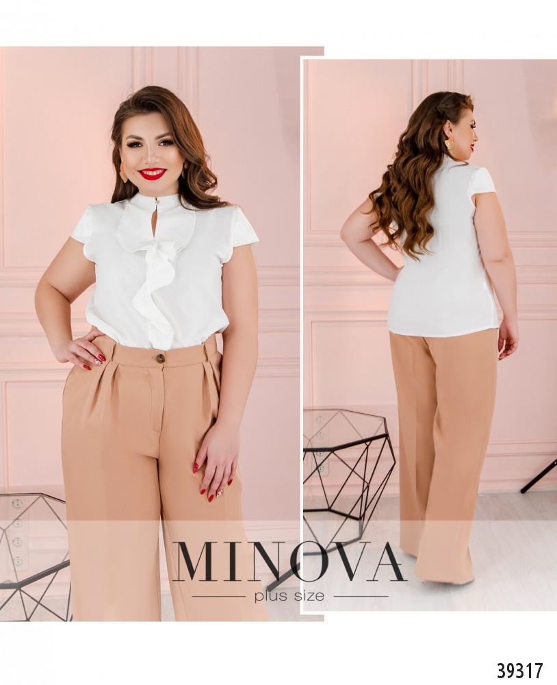 Стильная рубашка батал с небольшим жабо спереди, воротник - небольшая стоечка, застёгивается на одну пуговицу, под ней - неширокий вырез. Рукава короткие, карманов нет.