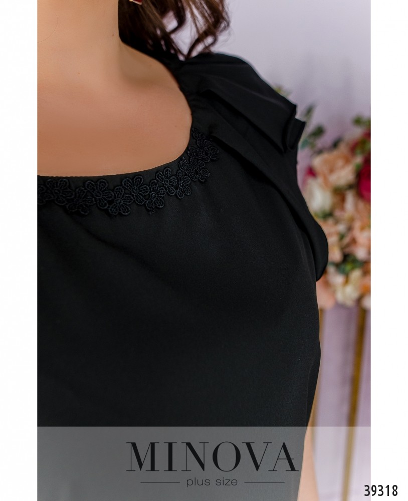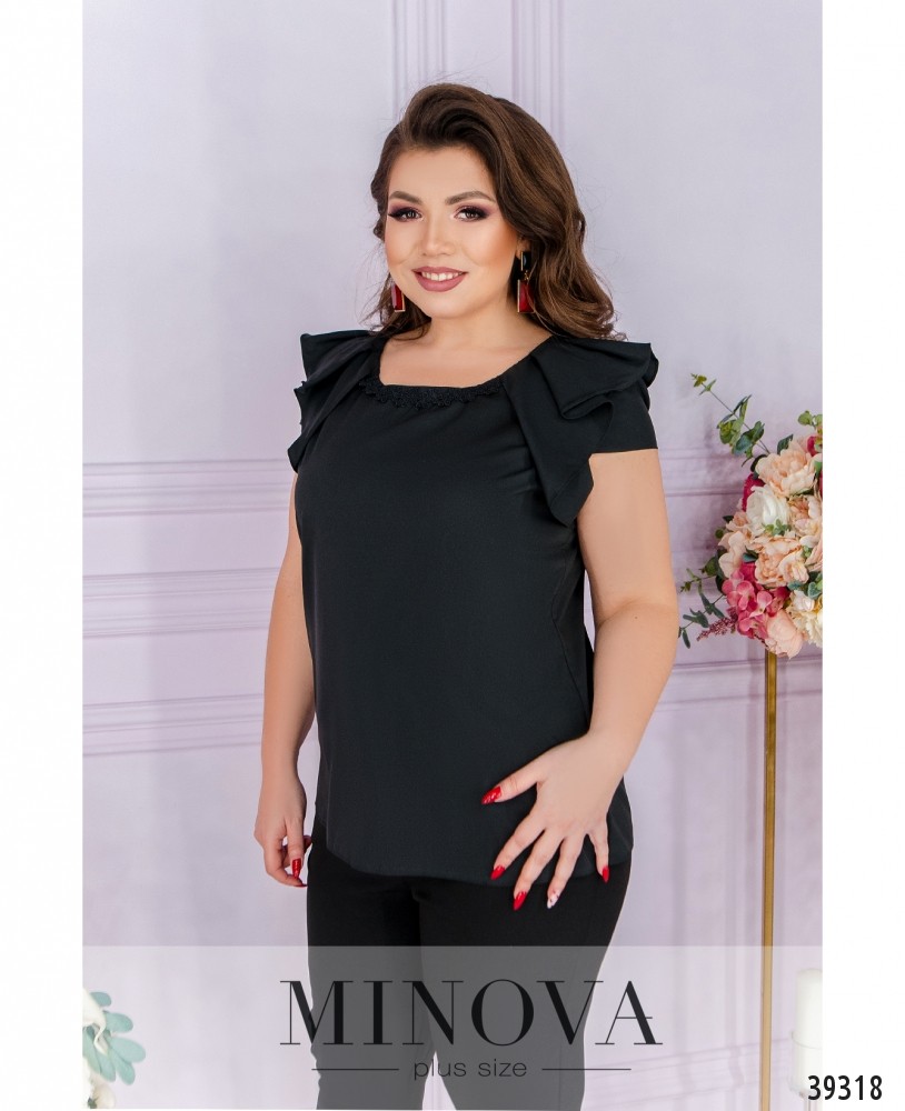 Привлекательная блуза батал с рукавом-воланом, вырез горловины "лодочка", украшен тонким кружевом спереди. Крой свободный, карманов и застёжек нет.