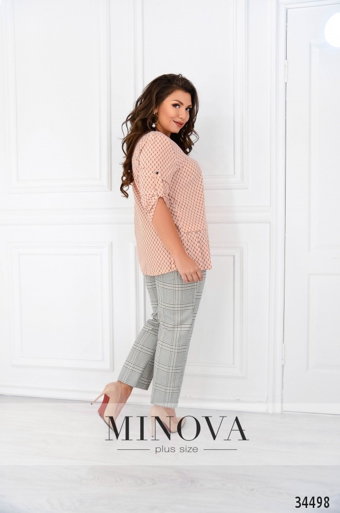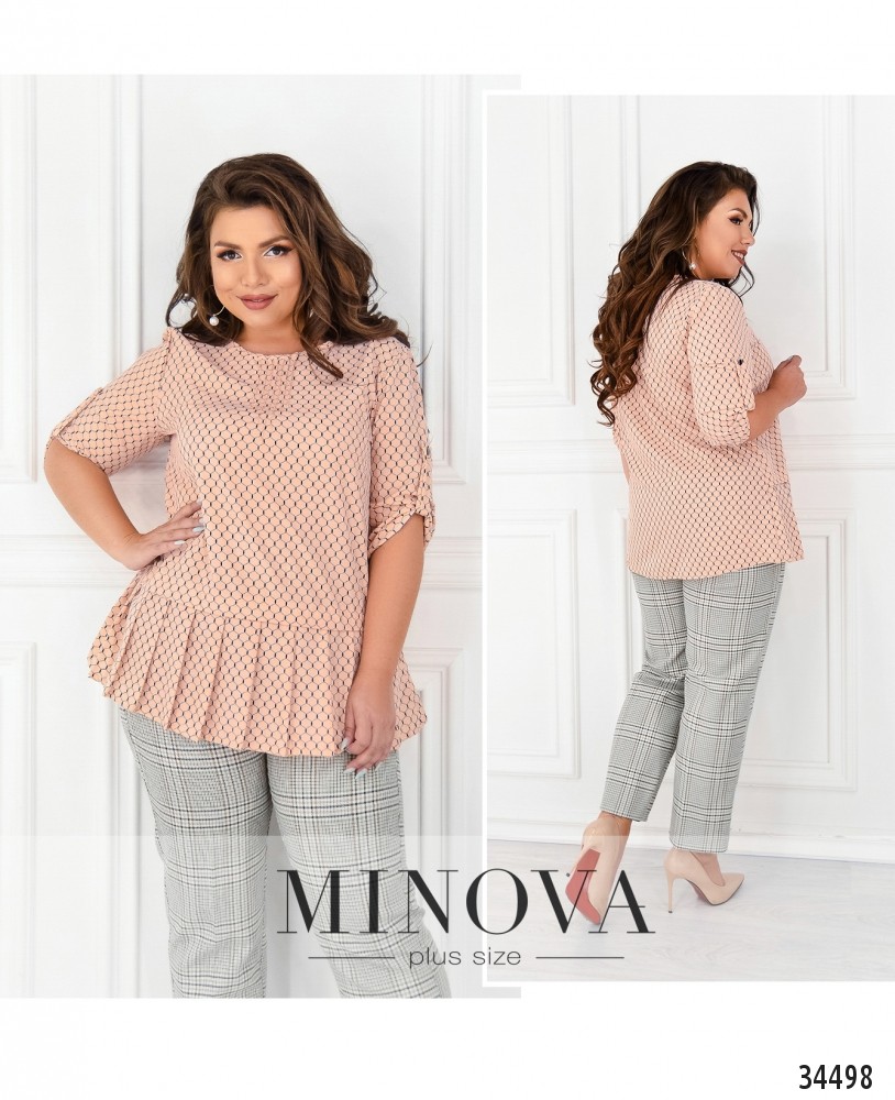 Лёгкая, воздушная и очень милая блуза батал из новой коллекции нарядов больших размеров от Minova разнообразит ваш повседневный гардероб. Блуза А-силуэта, к подолу подшит ряд плиссированных складок. Застёжек и карманов нет, рукава регулируются на пуговку и ленту, так что могут быть длиной ¾ или до локтя. Вырез горловины полукруглый, под ним – ряд небольших продольных вытачек. Принт блузы едва заметный, в виде пчелиных сот. Идеально будет сочетаться с джинсами или юбкой-карандашом, можете дополнить свой образ аксессуарами в тон или на контрасте.