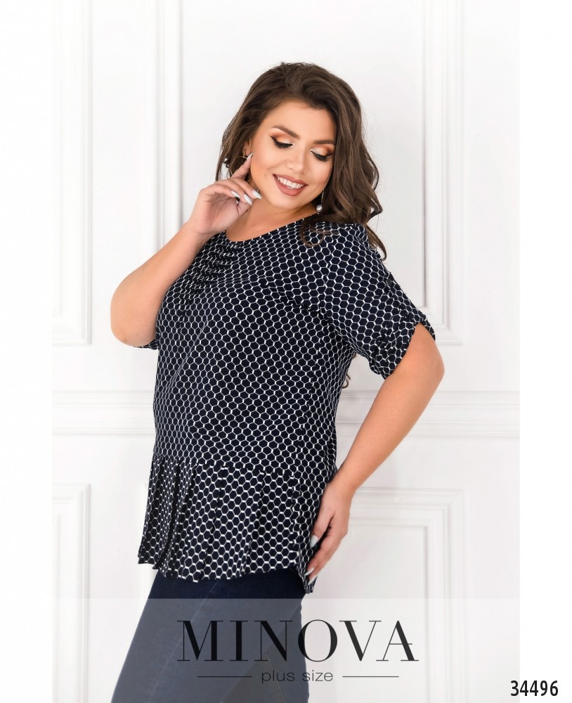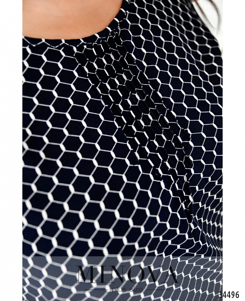 Лёгкая, воздушная и очень милая блуза батал из новой коллекции нарядов больших размеров от Minova разнообразит ваш повседневный гардероб. Блуза А-силуэта, к подолу подшит ряд плиссированных складок. Застёжек и карманов нет, рукава регулируются на пуговку и ленту, так что могут быть длиной ¾ или до локтя. Вырез горловины полукруглый, под ним – ряд небольших продольных вытачек. Принт блузы едва заметный, в виде пчелиных сот. Идеально будет сочетаться с джинсами или юбкой-карандашом, можете дополнить свой образ аксессуарами в тон или на контрасте.