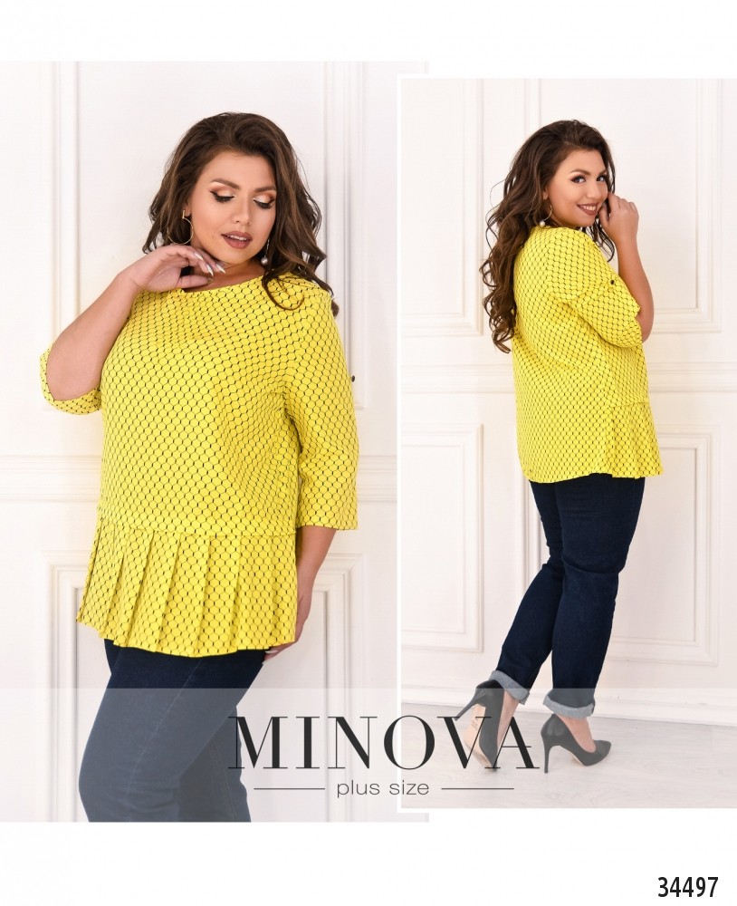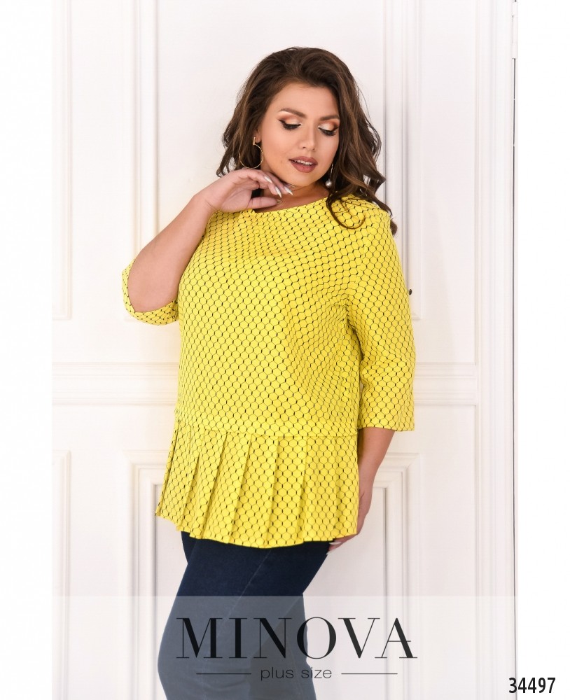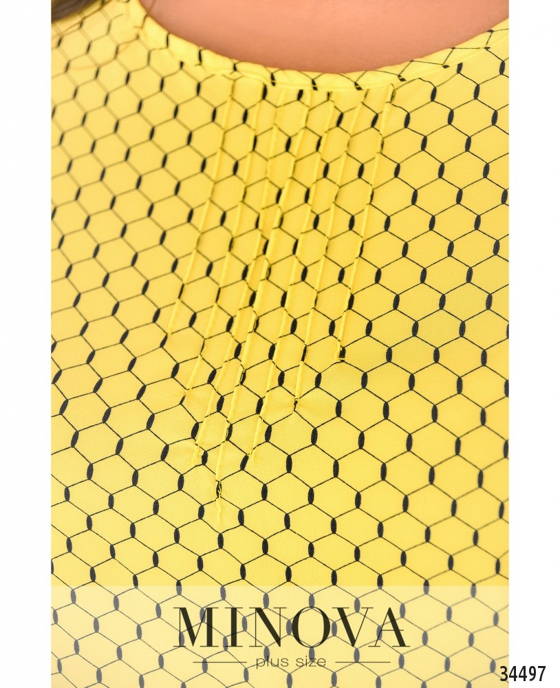 Лёгкая, воздушная и очень милая блуза батал из новой коллекции нарядов больших размеров от Minova разнообразит ваш повседневный гардероб. Блуза А-силуэта, к подолу подшит ряд плиссированных складок. Застёжек и карманов нет, рукава регулируются на пуговку и ленту, так что могут быть длиной ¾ или до локтя. Вырез горловины полукруглый, под ним – ряд небольших продольных вытачек. Принт блузы едва заметный, в виде пчелиных сот. Идеально будет сочетаться с джинсами или юбкой-карандашом, можете дополнить свой образ аксессуарами в тон или на контрасте.