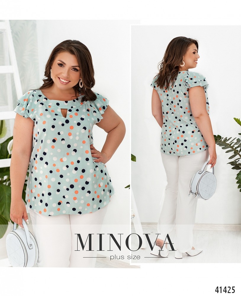 Нарядная и привлекательная блуза батал с украшенными оборками рукавами-крылышками. Вырез горловины полукруглый с небольшим "треугольником" внизу. Карманов и застёжек нет.