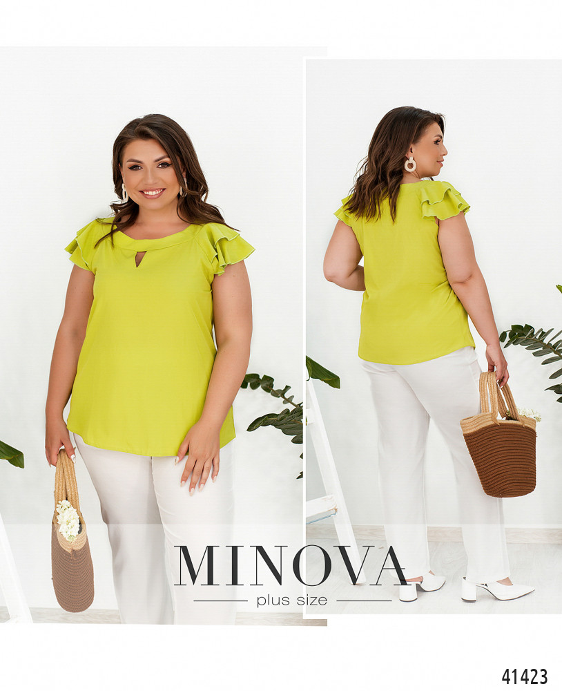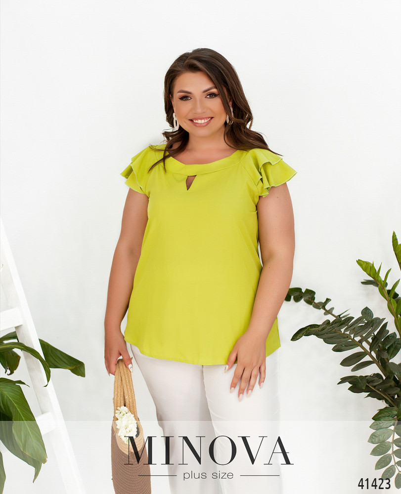 Нарядная и привлекательная блуза батал с украшенными оборками рукавами-крылышками. Вырез горловины полукруглый с небольшим "треугольником" внизу. Карманов и застёжек нет.