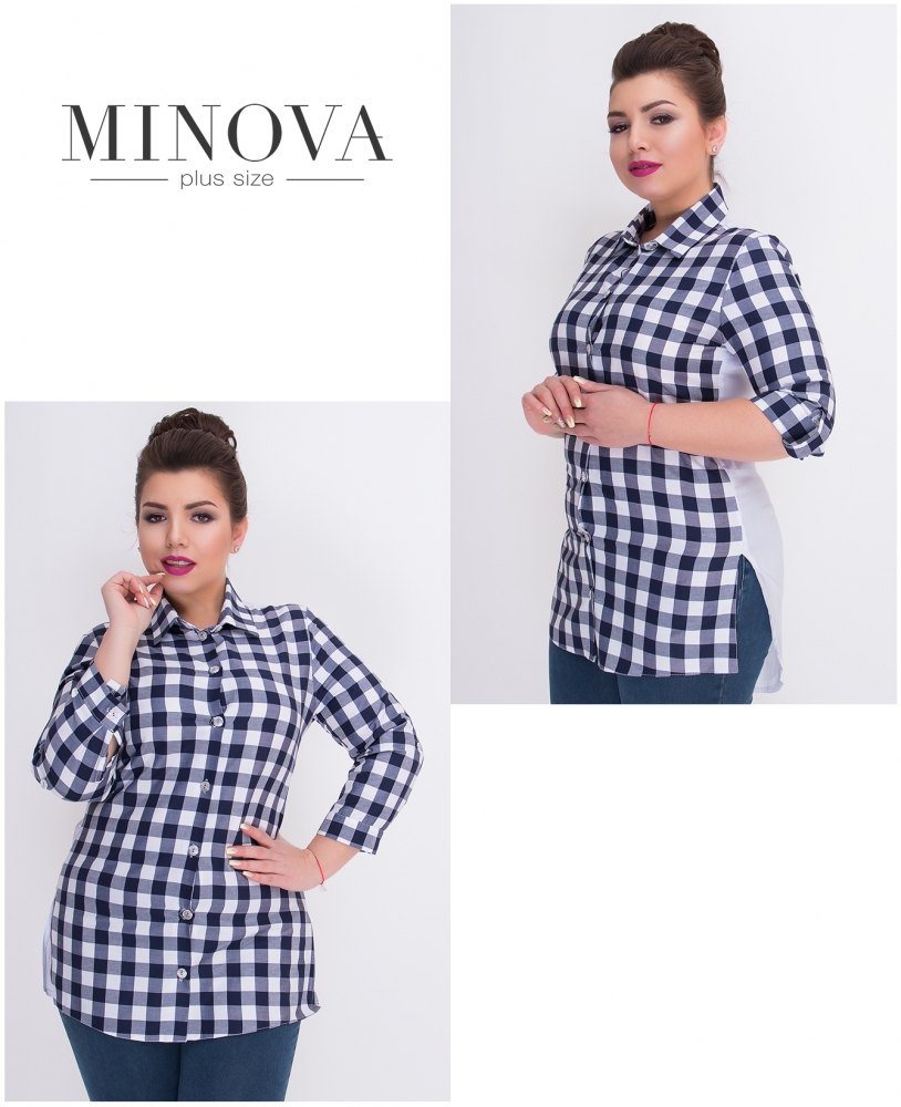 Приталенная рубашка на пуговицах с удлиненной спинкой и длинными рукавами. Рукава подкатываются и застегиваются на пуговицу. Подол с боковыми разрезами скруглен. Спинка украшена большой надписью из страз «SMILE ON YOU».