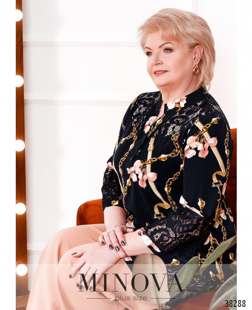 Нежная женственная рубашка-туника батал с кружевом на плечах, рукавах, спинке и подоле. Воротник-стоечка, под ним – две пуговицы. Крой свободный, карманов нет.
