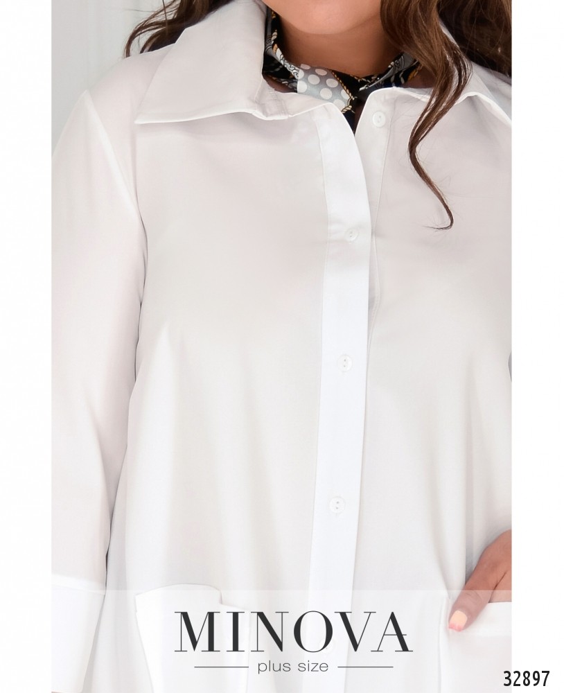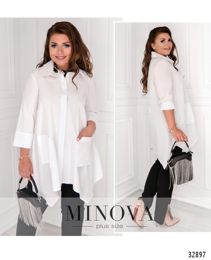 Асимметричный подол этой рубашки батал из свежего пополнения каталога Minova понравится девушкам с фигурой типа «перевёрнутый треугольник»: по бокам рубашка чуть длиннее. В остальном её крой классичен: отложной воротничок, ряд пуговиц сверху до низу. Но есть маленький нюанс: накладные карманы по бокам и ещё – рукава ¾, с широкими манжетами, благодаря чему даже в жаркий сентябрьский день будет комфортно. Цвета минималистичны: чёрный, белый, тёмно-синий, так что все варианты впишутся в базовый гардероб, который можно разнообразить аксессуарами и обувью.
