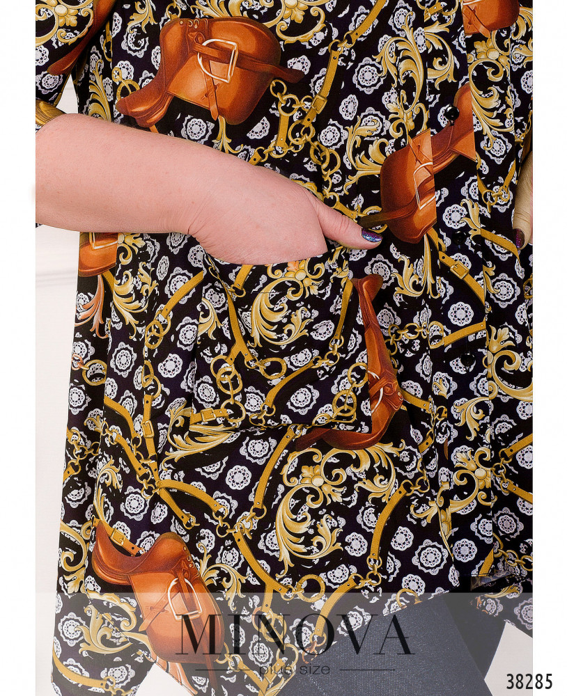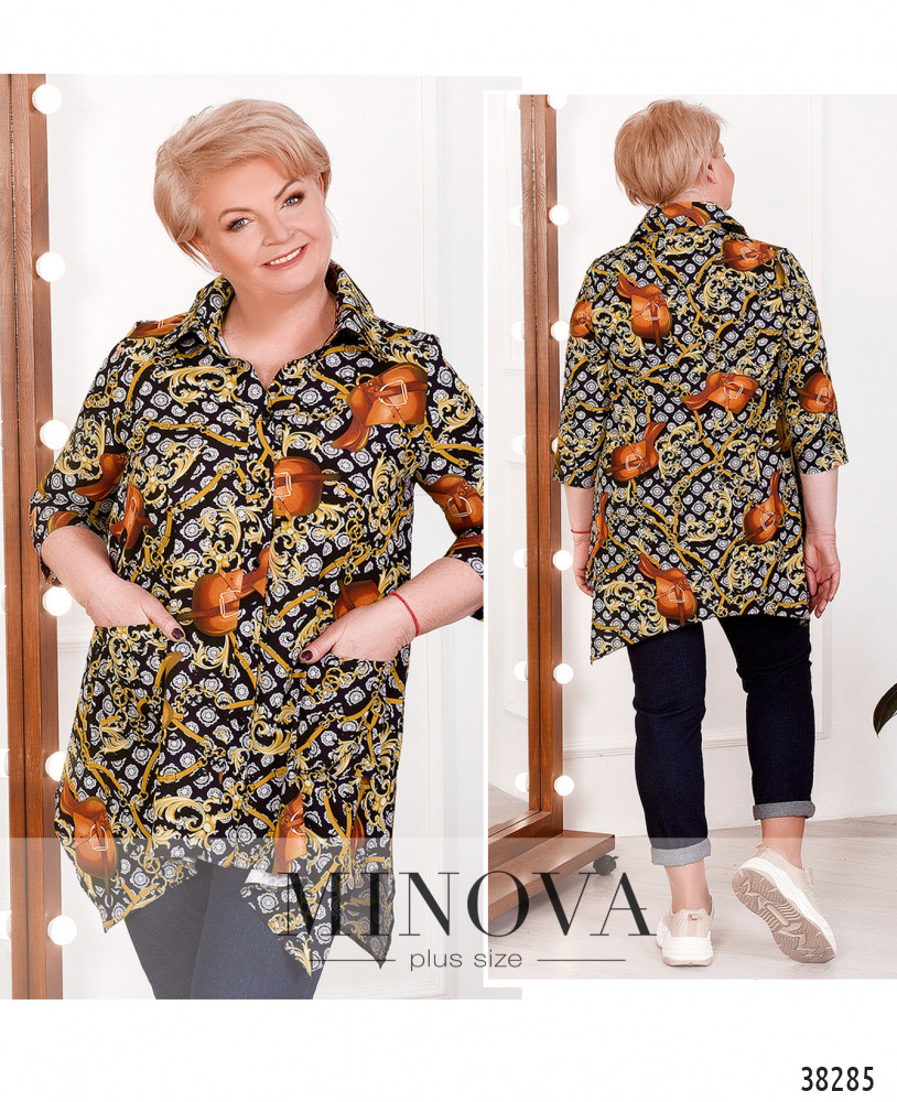 Нарядная рубашка-туника большого размера с ярким принтом. Воротничок отложной, спереди – ряд пуговиц на планке. Рукава с широкими манжетами без пуговиц, подол по бокам длиннее. Спереди – нашитые накладные карманы. Принт украшен блёстками.