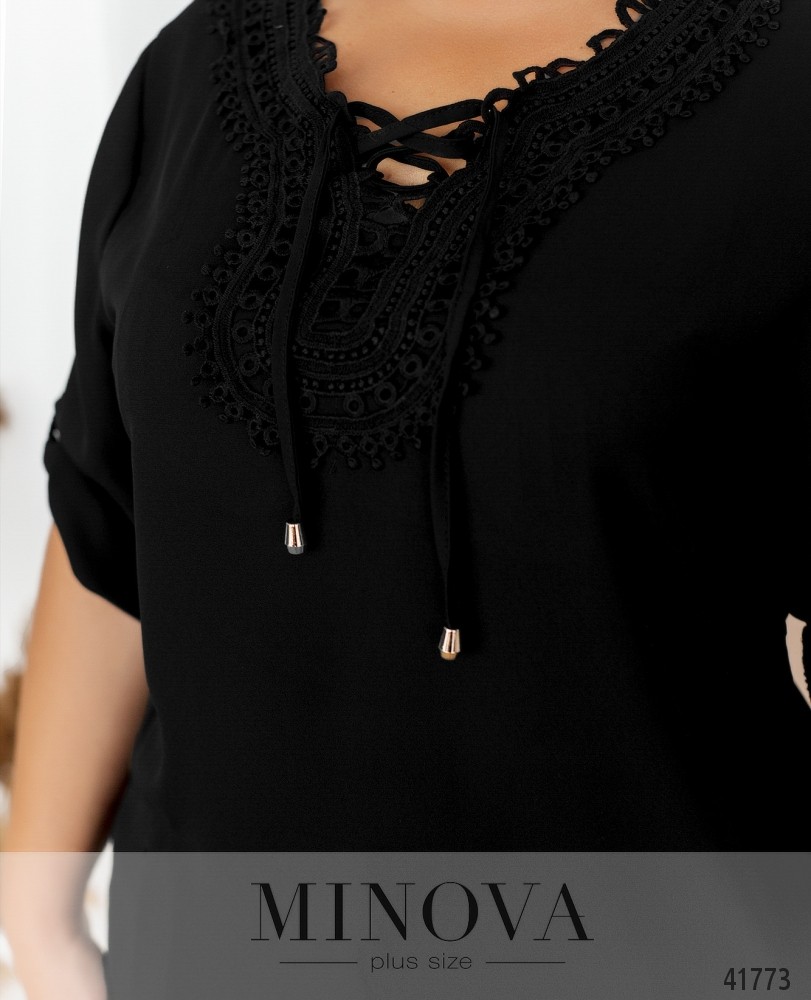 Женственная рубашка с кружевом на груди и плечах, завязывается на шнуровку, шнурки с наконечниками. Рукава регулируются на пуговку и ленту. Застёжек и карманов нет.