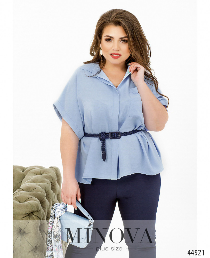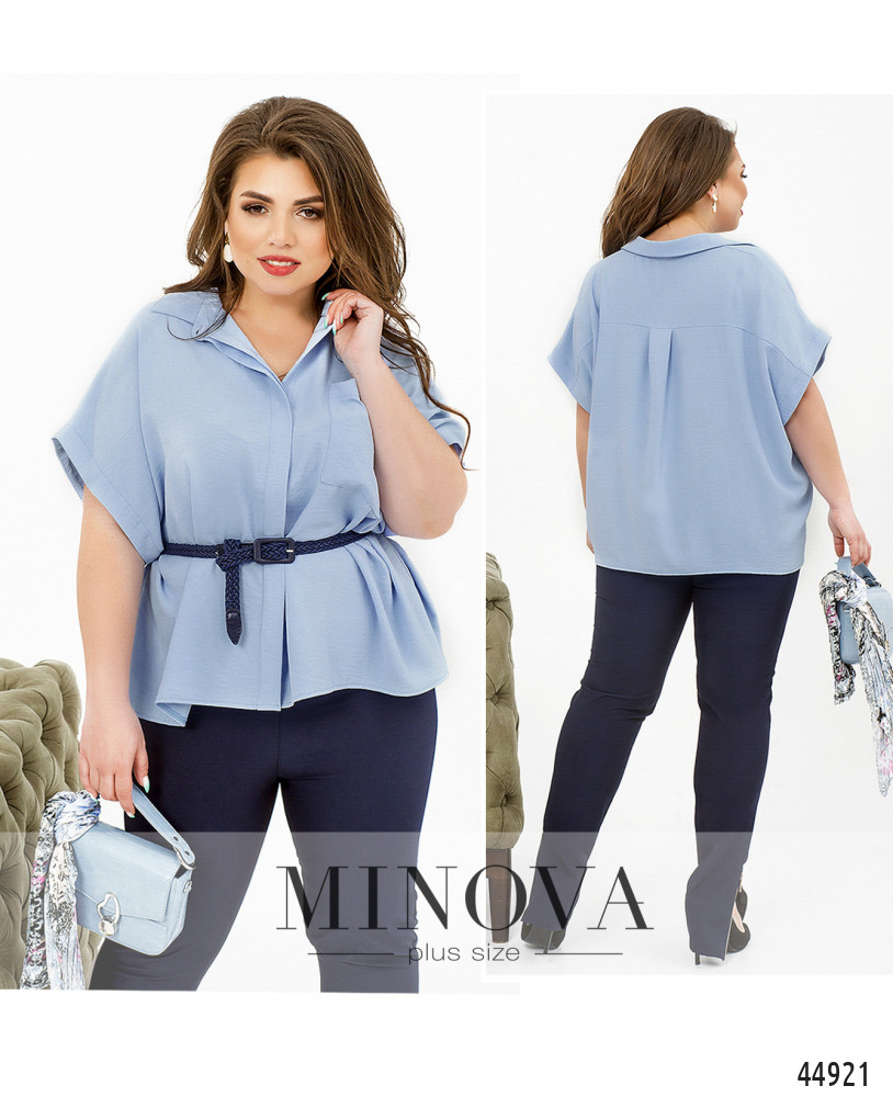 Элегантная рубашка плюс сайз с накладным карманом на груди, воротничок отложной, застёжка супатная (потайная) - пуговицы прикрыты верхней планкой. Рукава спущенные, без манжет. Подкладки нет.