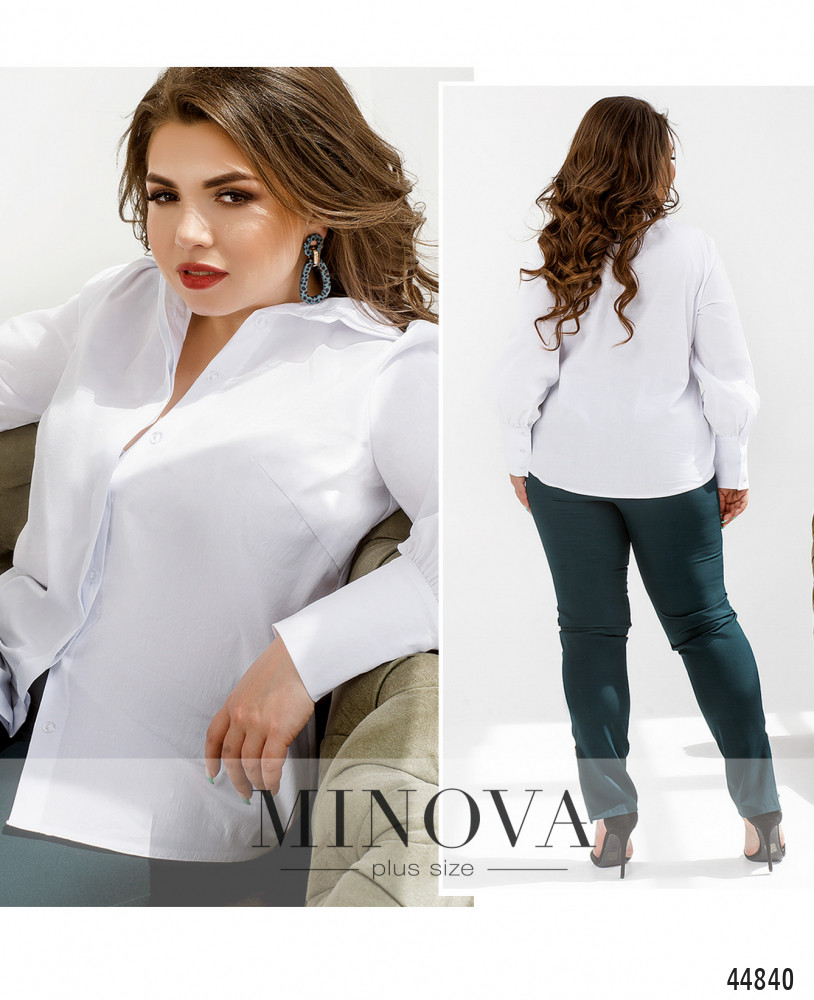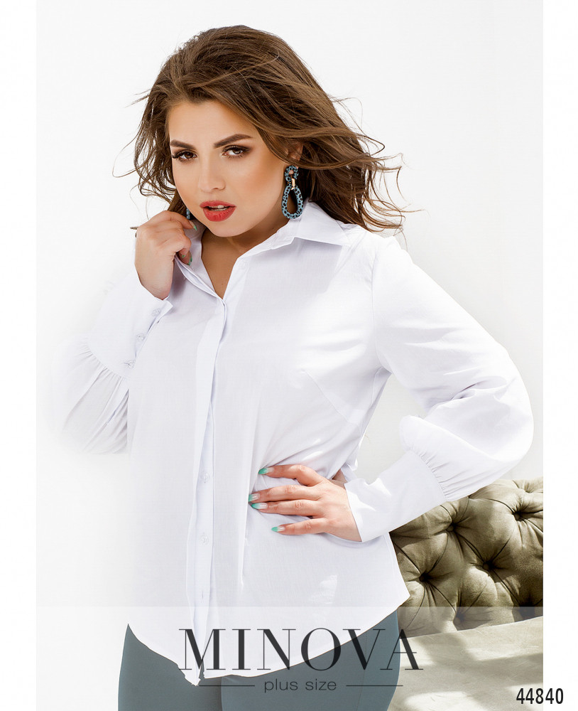 Стильная классическая рубашка батал с отложным воротничком. На рукавах длинные манжеты, на них по три пуговицы. Крой прямой, спереди - пуговицы на супатной (потайной) застёжке, прикрываются верхней планкой. На груди диагональные вытачки. Карманов нет.
