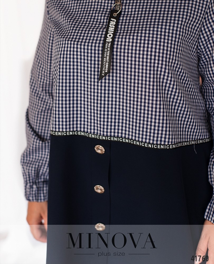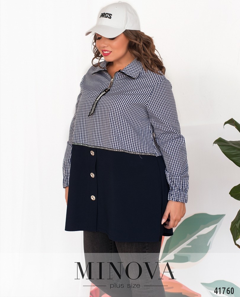 Стильная длинная рубашка батал с декоративными пуговицами на подоле. Воротничок отложной, под ним - рабочая молния до середины груди. Рукава со вшитой в манжеты резинкой. Карманов нет.